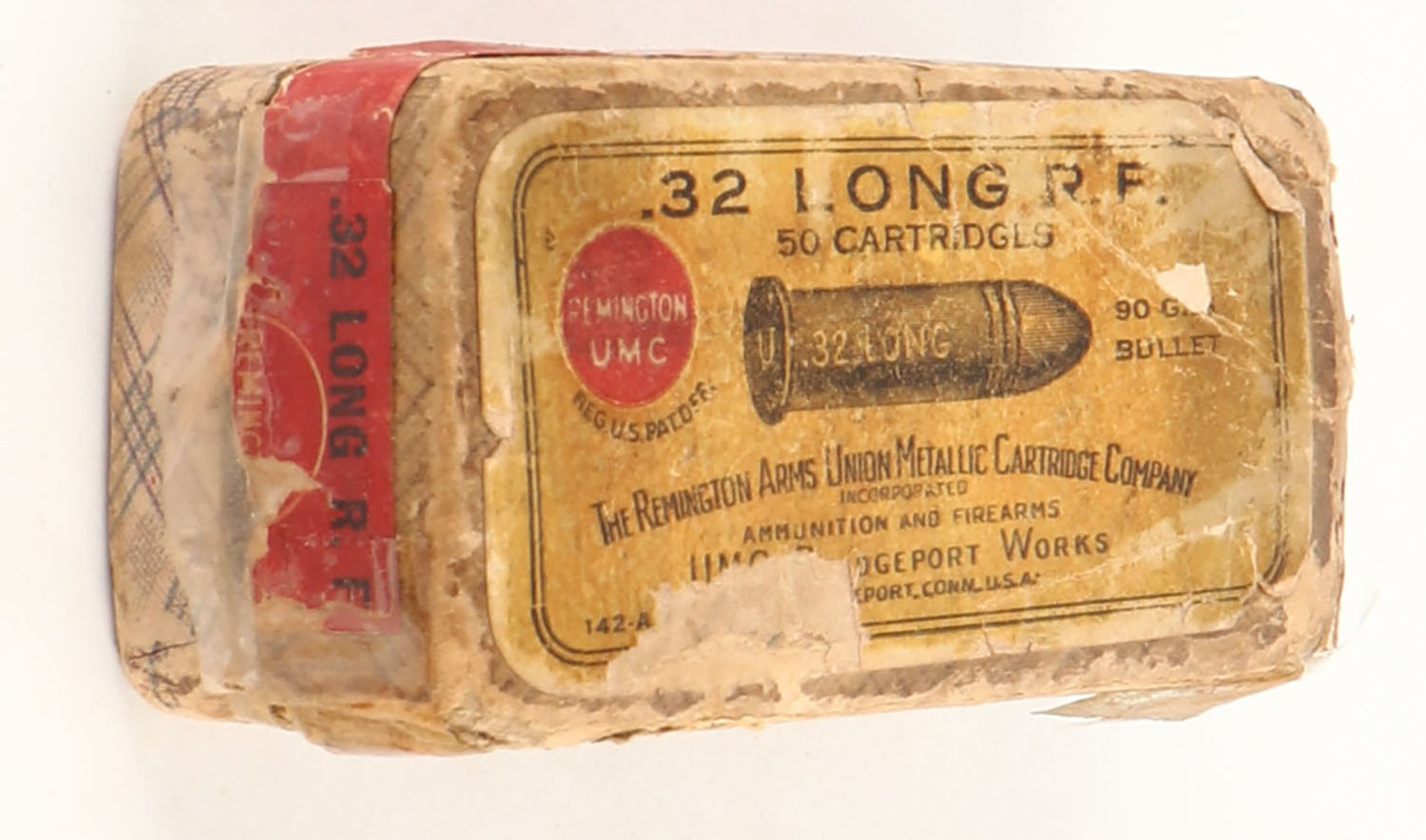 REM-UMC, R.F. Cartridges, .32 Long Rim Fire, 90 Grain Bullet, Partial 41rds. Of mixed H/S (mostly correct), 2pc. Purple fabric box with yellow top & red side sealing labels, box is solid with good color, some age soiling & shelf wear, tape on corners of lid, vertical seam splits of front corners of lid, side sealing label is 50% intact, ammo is very good. Grade: Good - Value: 40 to 120