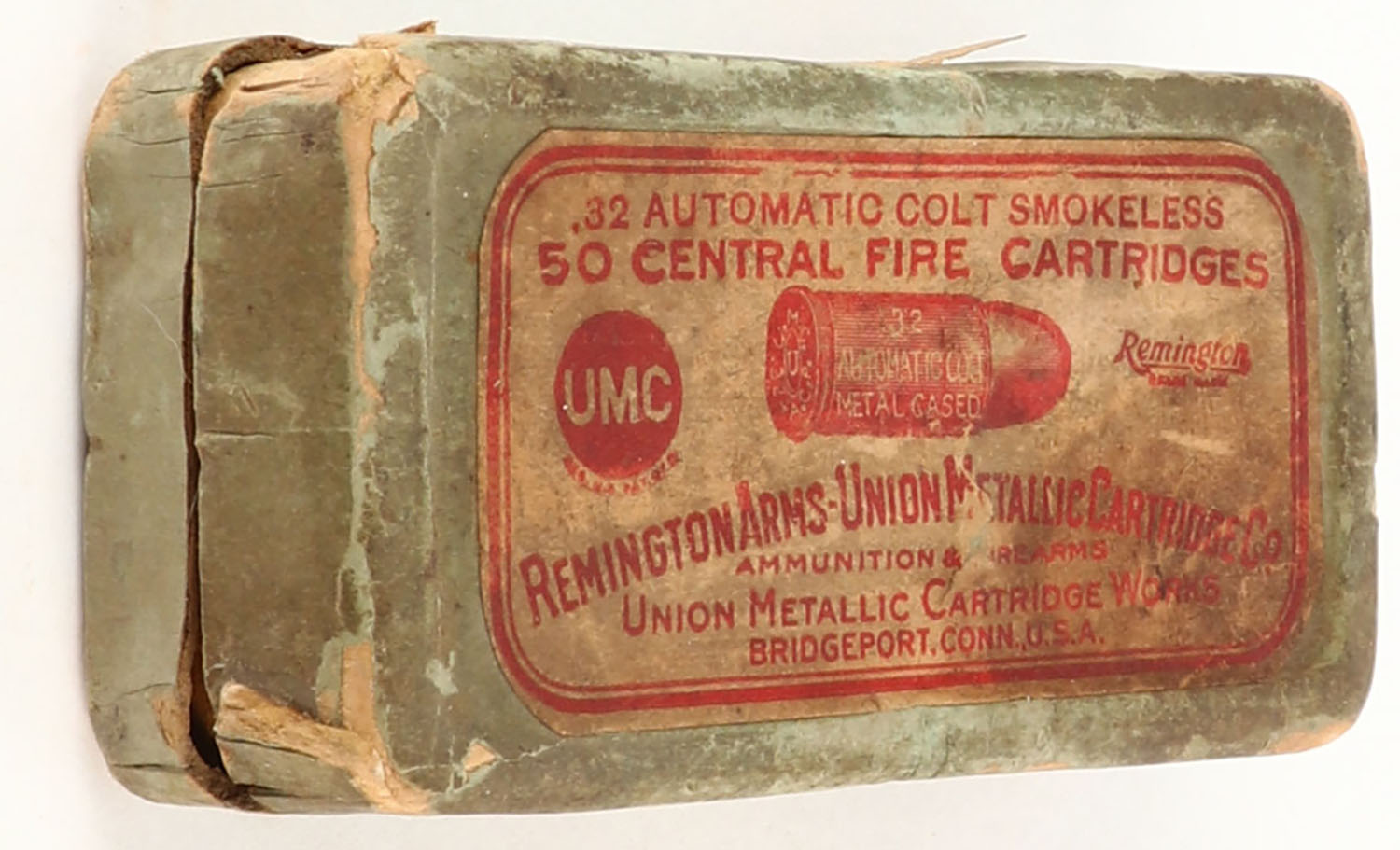 REM-UMC, Central Fire Cartridges, .32 Automatic Colt, Partial 37rds. correct, 2pc. Blue box with buff top & side sealing labels, box is solid with fair to good color, age soiling, large stain on top, some corner wear, minor edge wear, side sealing label is 5% intact, ammo is excellent. Grade: Good - Value: 10 to 50