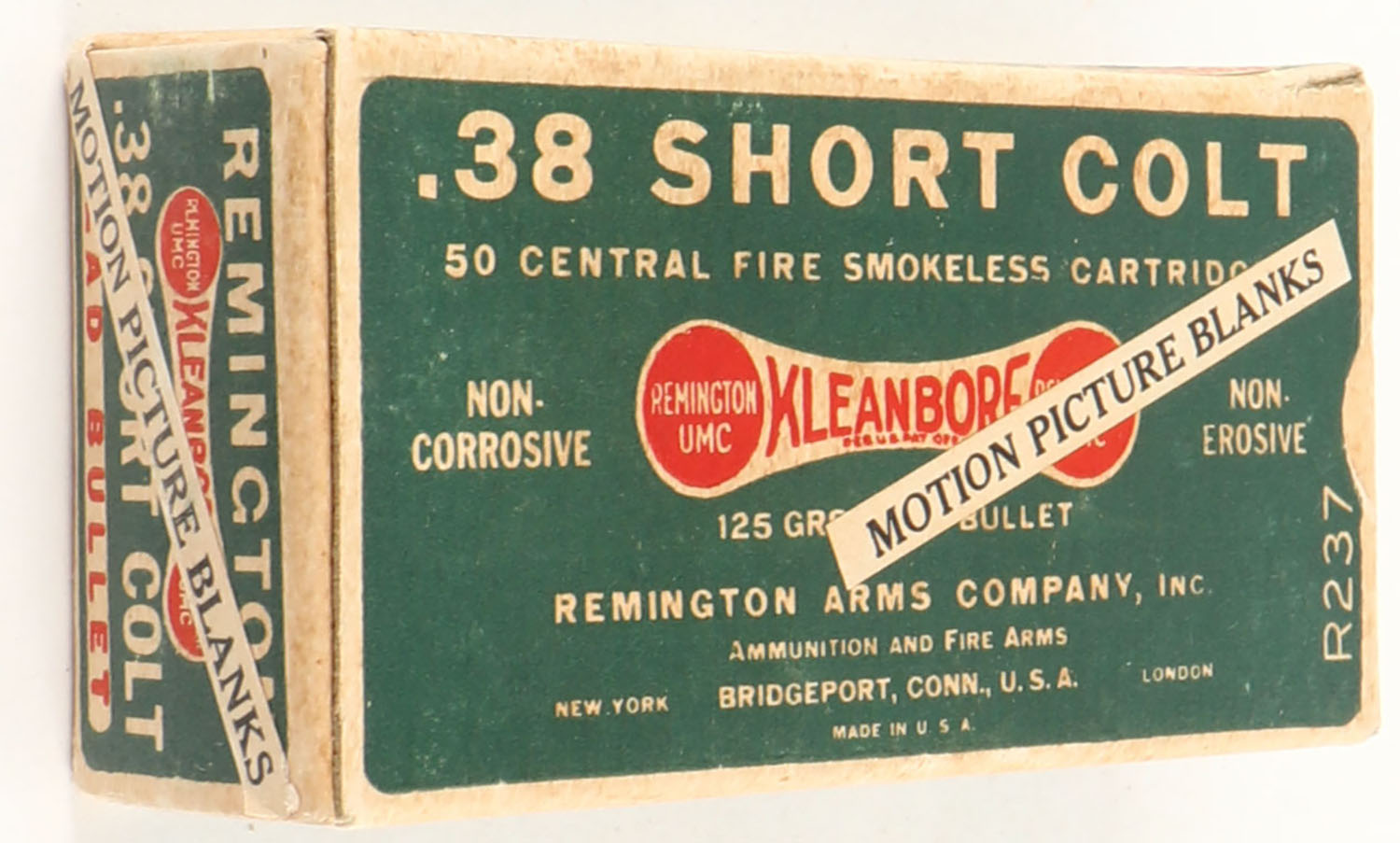 Remington, Kleanbore Motion Picture Blanks, .38 Short Colt, Full, 1pc. Green buff & red dog bone box with white over-label, box is solid with excellent color, very minor age soiling & shelf wear, edges are mostly crisp, end flaps are solid, ammo is excellent. Grade: Excellent + - Value: 40 to 200