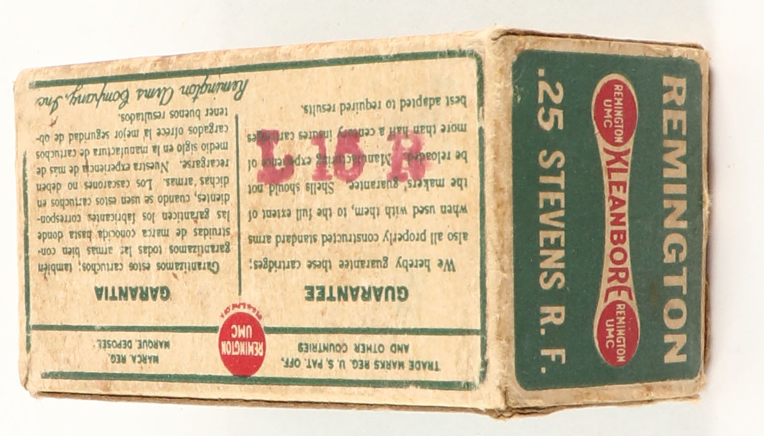 Remington, Kleanbore, .25 Stevens Rim Fire, Full, 1pc. Green buff & red dog bone box, box is solid with very good to excellent color, some age soiling, top has been written on, some edge & corner wear, end flaps are solid, ammo is excellent. Grade: Very Good + - Value: 60 to 180