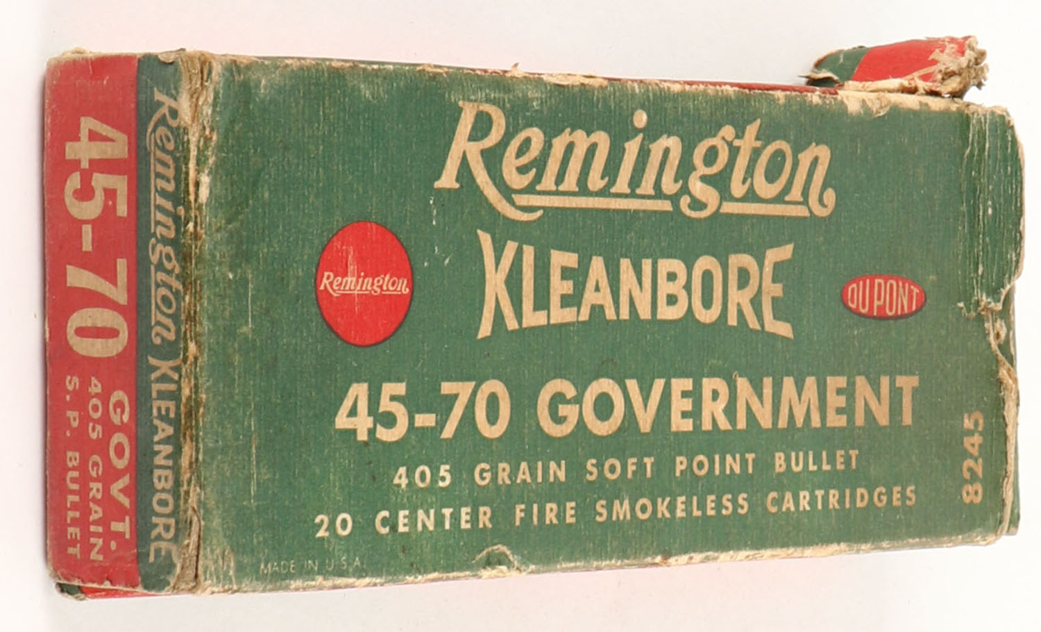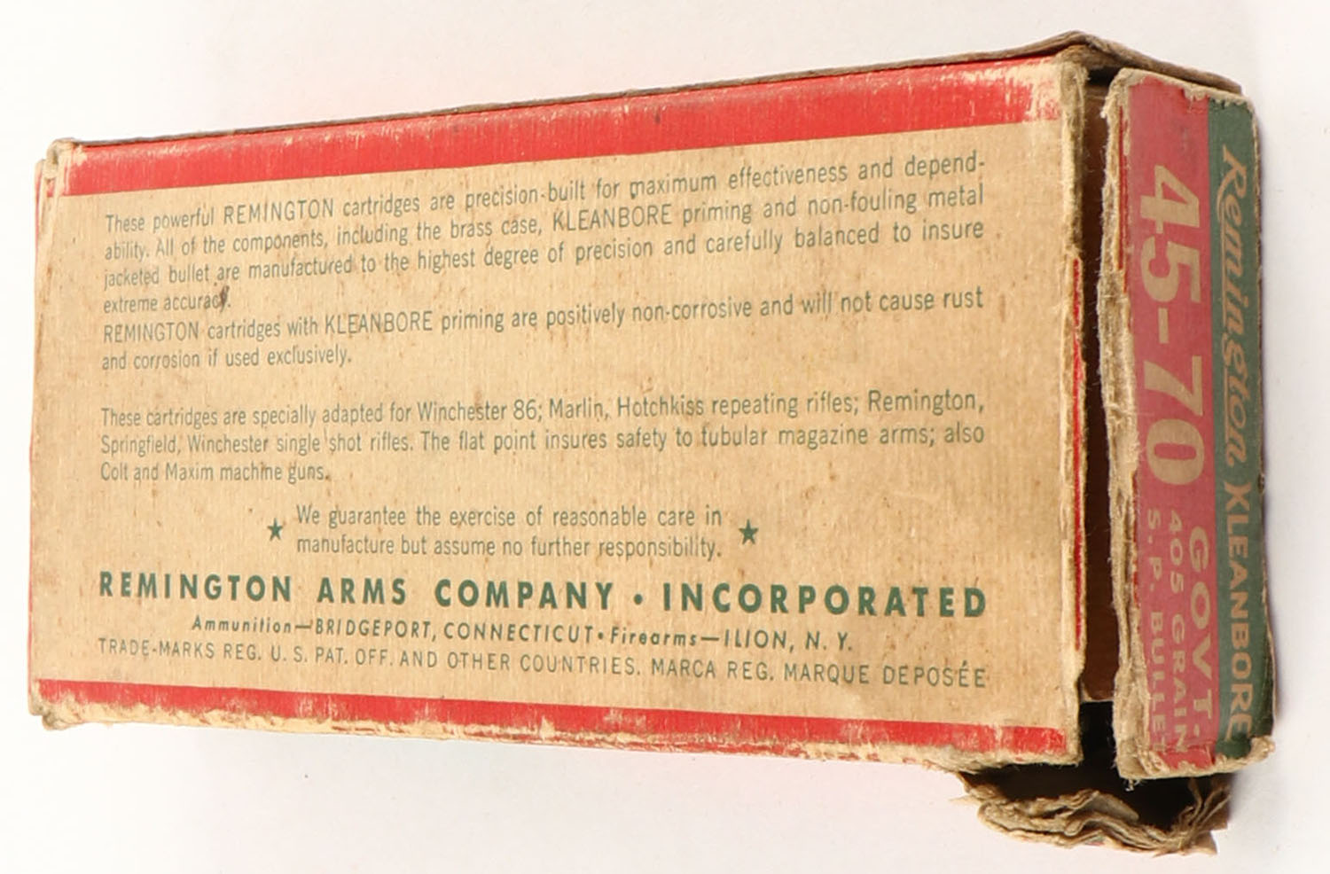 Remington, Kleanbore, .45-70 Government, 405 Grain Soft Point Bullet, Partial 19rds. of incorrect ammo, 1pc. Green red & buff box, right end flap is torn, very good color, age soiling & shelf wear, some edge & corner wear, left end flap is solid, ammo is very good. Grade: Very Good - Value: 10 to 40