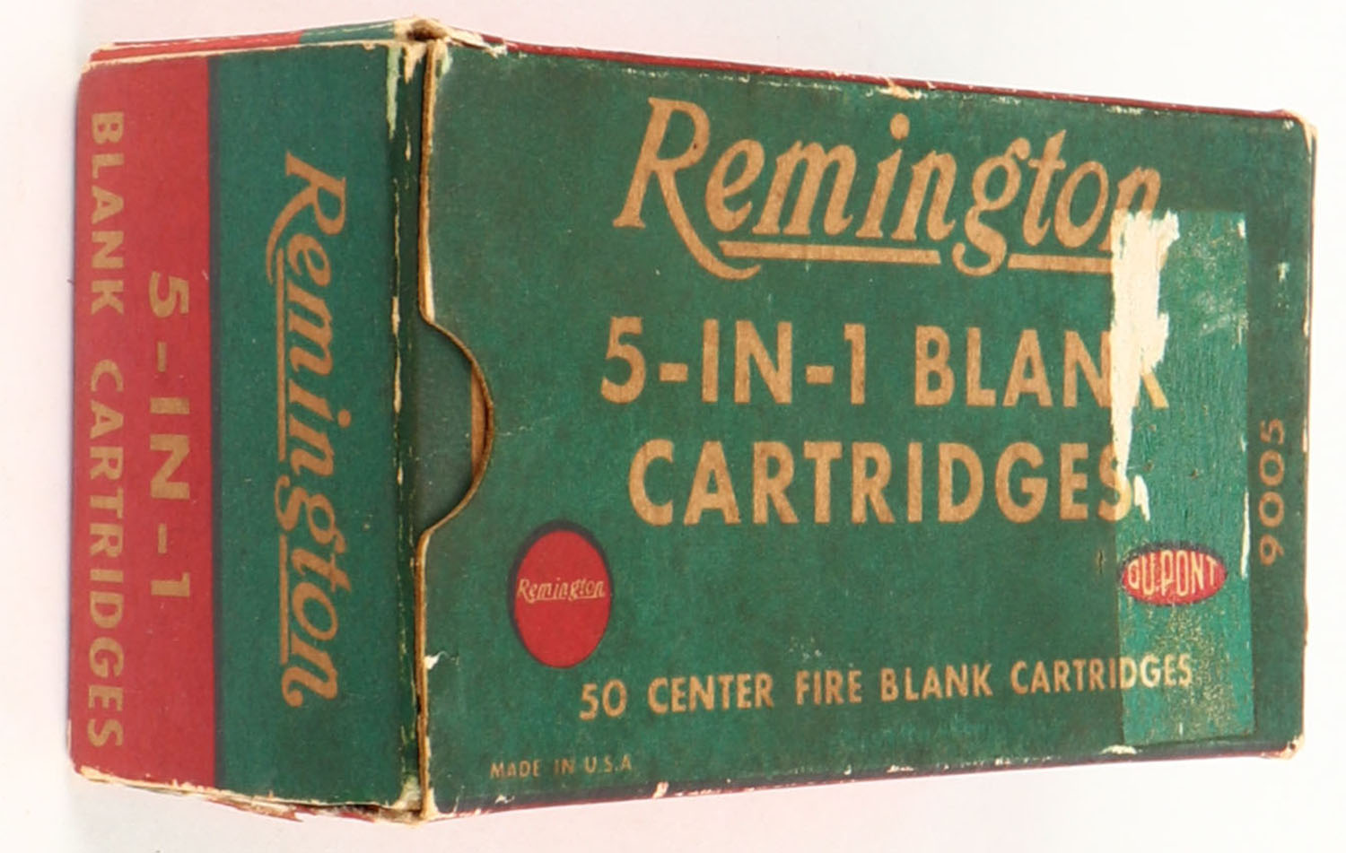 Remington, 5-in-1 Blank Cartridges, Partial 45rds., 1pc. Green red & buff box, box is solid with very good color, age soiling, tape stain on top, minor corner wear, very minor edge wear end flaps are solid, ammo is excellent. Grade: Very Good + - Value: 14 to 40