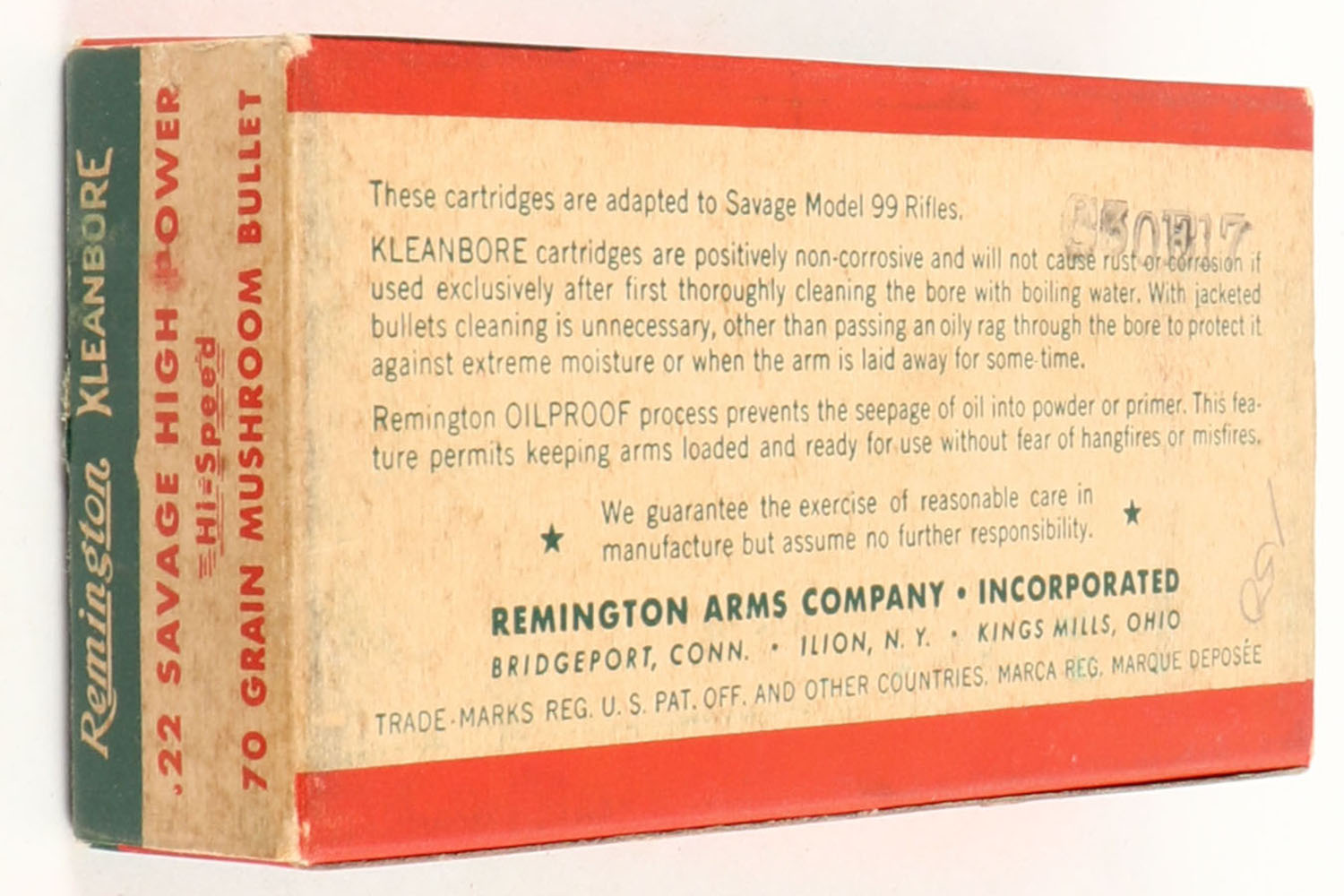 Remington, Kleanbore Hi-Speed, .22 Savage High Power, 70 Grain Mushroom Bullet, Full, 1pc. Green buff & red box, box is solid with very good to excellent color, minor age soiling & corner wear, edges are mostly crisp, end flaps are solid, ammo is very good to excellent. Grade: Excellent - Value: 20 to 60