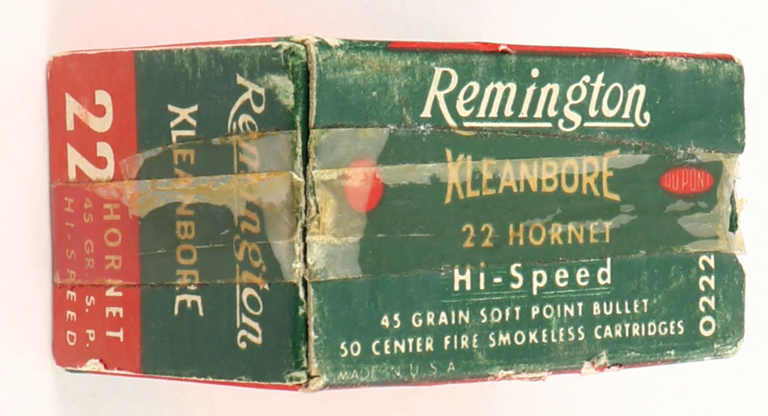 Remington, Kleanbore Hi-Speed, .22 Hornet, 45 Grain Soft Point Bullet, Full, 1pc. Green red & white box, box is solid with very good color, box is wrapped in tape, sticker residue on front, minor age soiling & edge wear, some corner wear, end flaps are solid, ammo is excellent. Grade: Very Good - Value: 30 to 90