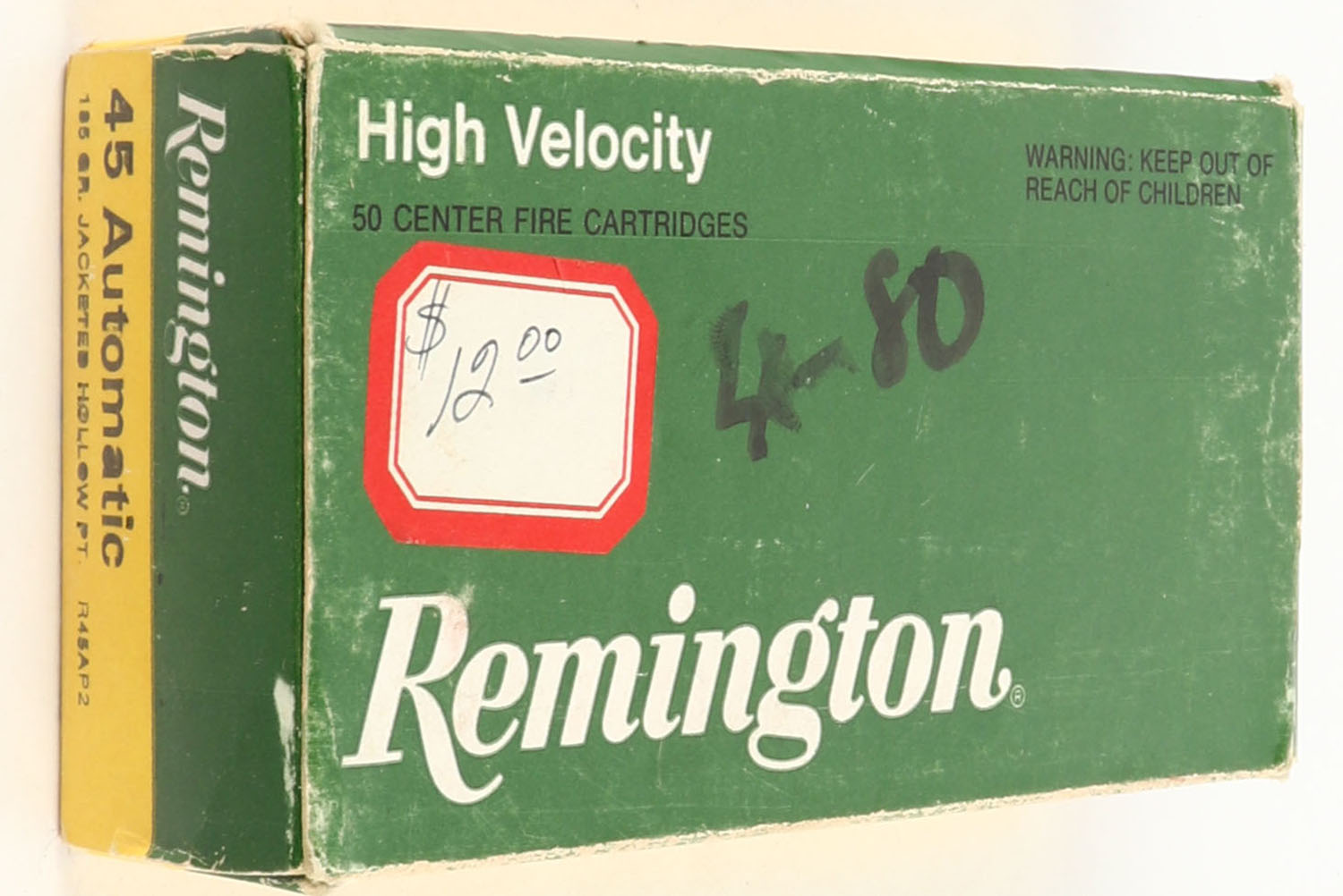 Remington, High Velocity, .45 Automatic, 185 Grain Jacketed H.P., Full, 1pc. Green & yellow box, box has age soiling with edge wear, has sticker & writing to top, ammo is excellent. Grade: Very Good - Value: 10 to 40