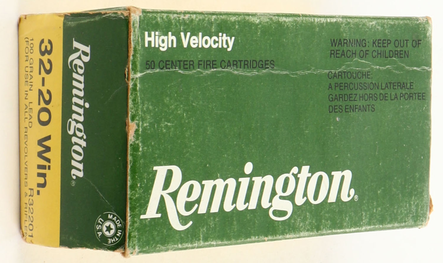 Remington, High Velocity, 32-20 Winchester, 100 Grain Lead, Full, 1pc. Green & yellow box, box has scuffing with light age soiling, ammo is excellent. Grade: Very Good + - Value: 50 to 150