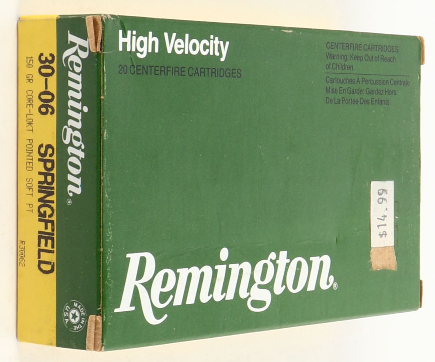 Remington, High Velocity, .30-06 Springfield, 150 Gr. Core-Lokt Pointed Soft Point, 1pc, Full, green/yellow box with white/black print, box is very solid with great colors, ammo is minty. Grade: Excellent ++ - Value: 20 to 60