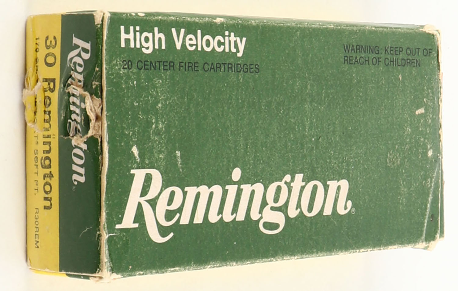 Remington, High Velocity, .30 Remington, 170 Gr. Soft Point Core-Lokt Bullet, 1pc, Full, green/yellow box with white/black print, box has edge wear with scuffing, ammo is very good. Grade: Very Good - Value: 30 to 60