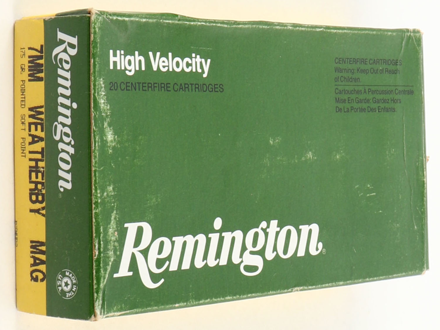 Remington, High Velocity, 7mm Weatherby Mag., 175 Gr. Pointed S.P., 1pc, Full, green/yellow box with white/black print, box is solid with minor rub marks & minor edge wear, ammo is excellent. Grade: Excellent - Value: 14 to 40