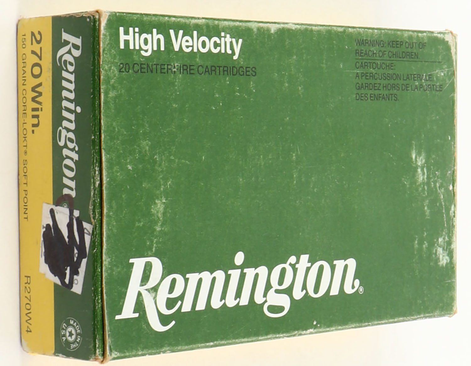 Remington, High Velocity, 270 Win., 150 Gr. Core-Lokt Soft Point, Partial 17rds, 1pc. Yellow, green, white & black box, box is solid with edge wear, end flaps are solid, ammo is very good. Grade: Very Good ++ - Value: 10 to 40