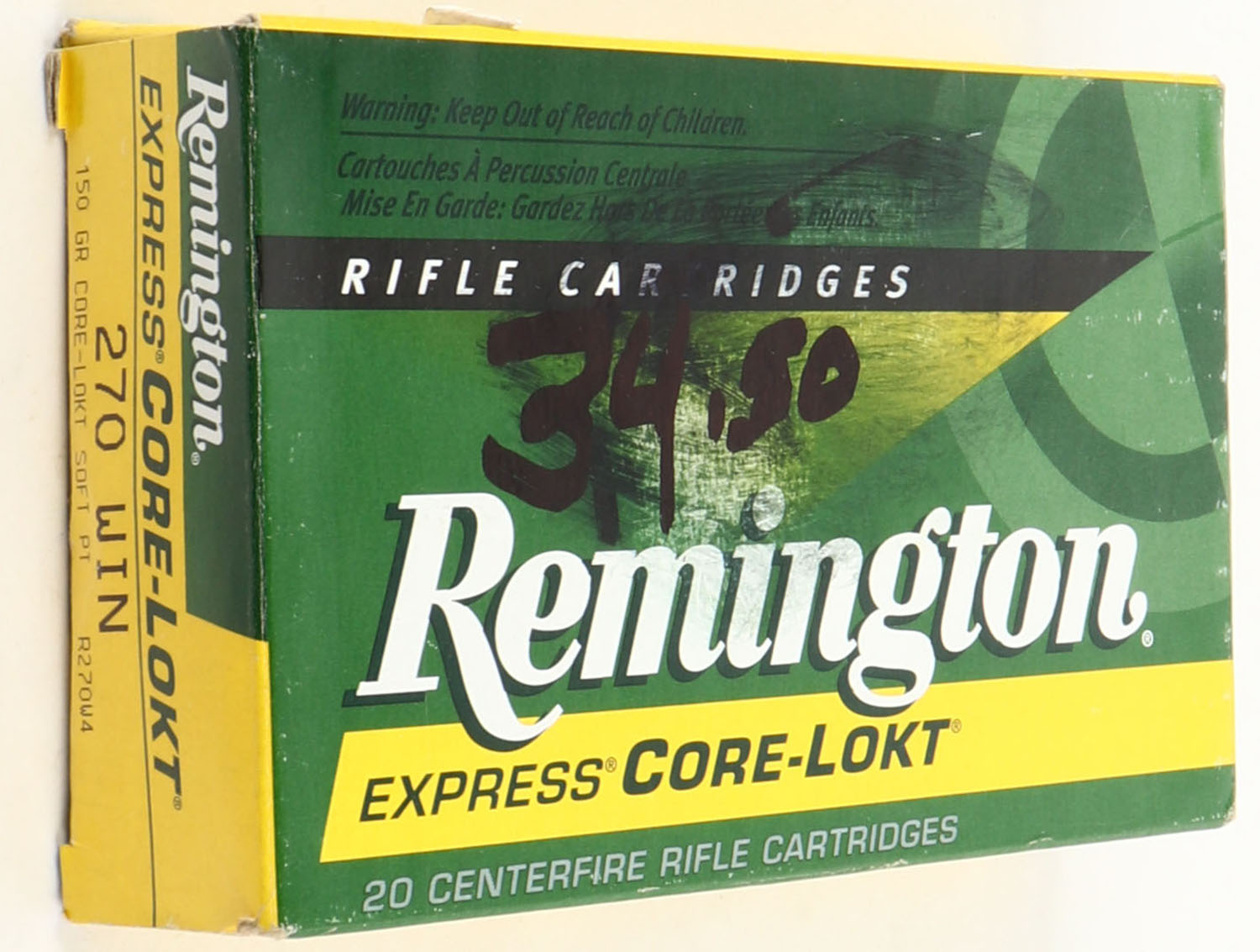 Remington, Express Core-Lokt, .270 Win, 150 Gr. Core-Lokt PSP Bullet, Multi-colored box, box is solid with light rub marks, has writing to top, ammo is excellent. Grade: Very Good + - Value: 16 to 60