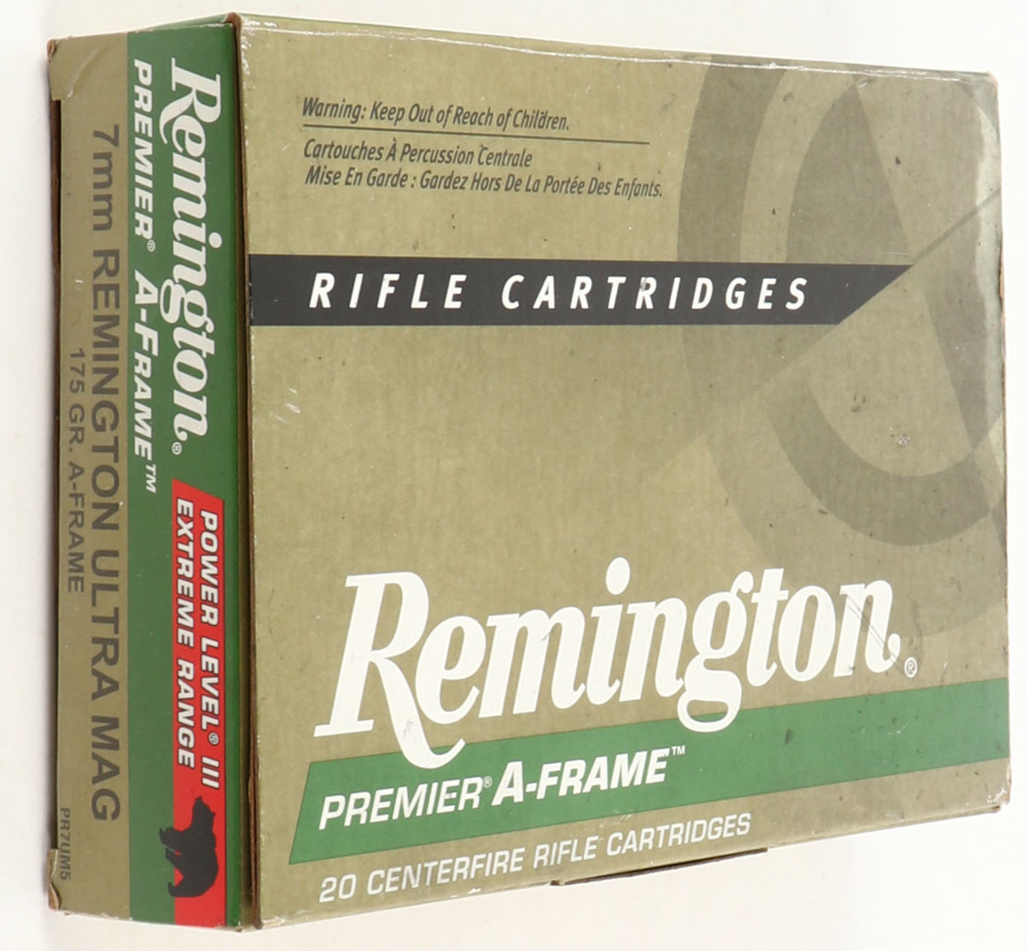 Remington, Premier A-Frame, 7mm Remington Ultra Mag, 175 Grain A-Frame, Partial 16rds, 1pc. Gold, green, white & black box, box is solid with some edge wear, ammo is excellent. Grade: Very Good - Value: 20 to 60