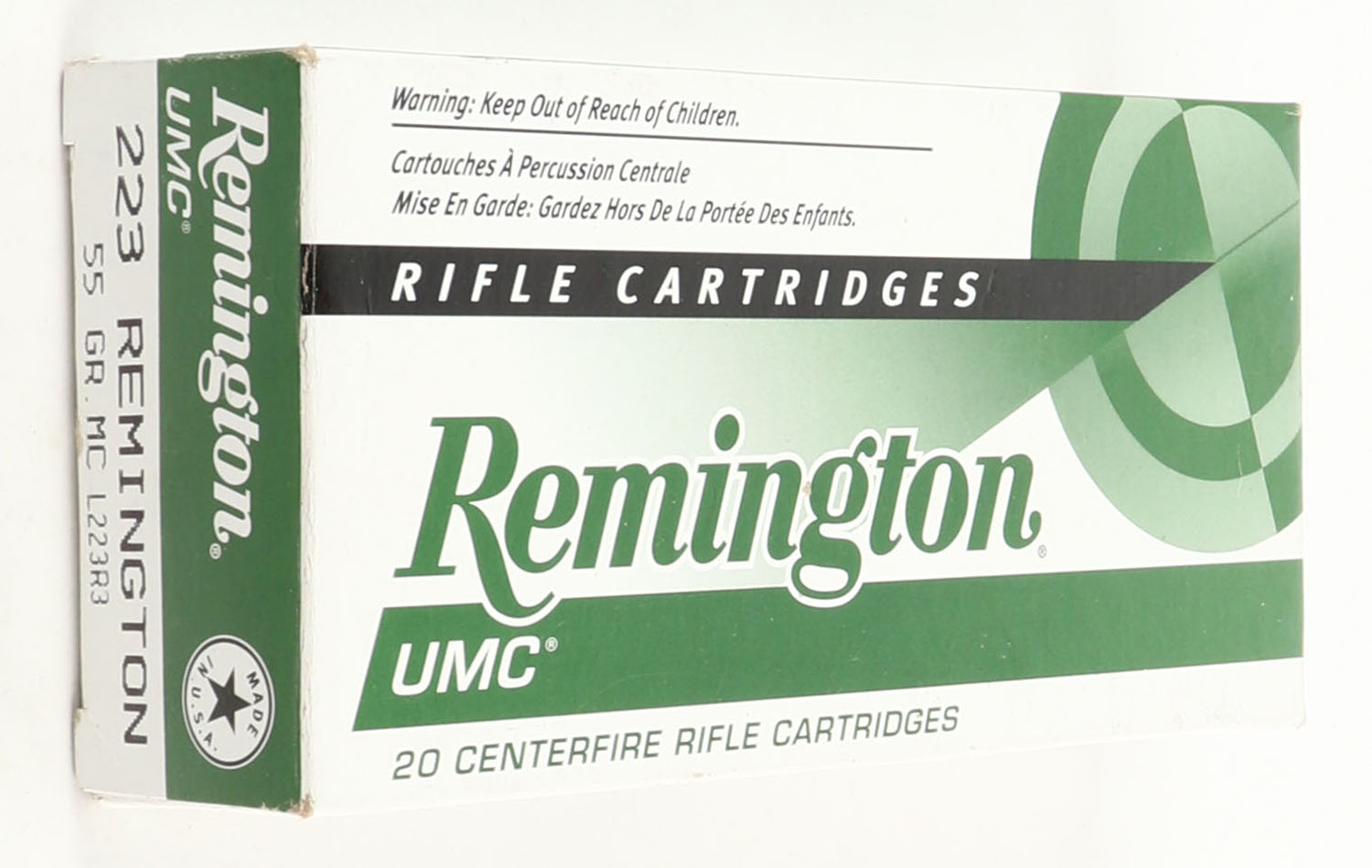 Remington, UMC, .223 Remington , 55 Grain, Full, 1pc. Green, white & black box, box is solid with great color, end flaps are solid, ammo is excellent. Grade: Excellent + - Value: 10 to 40