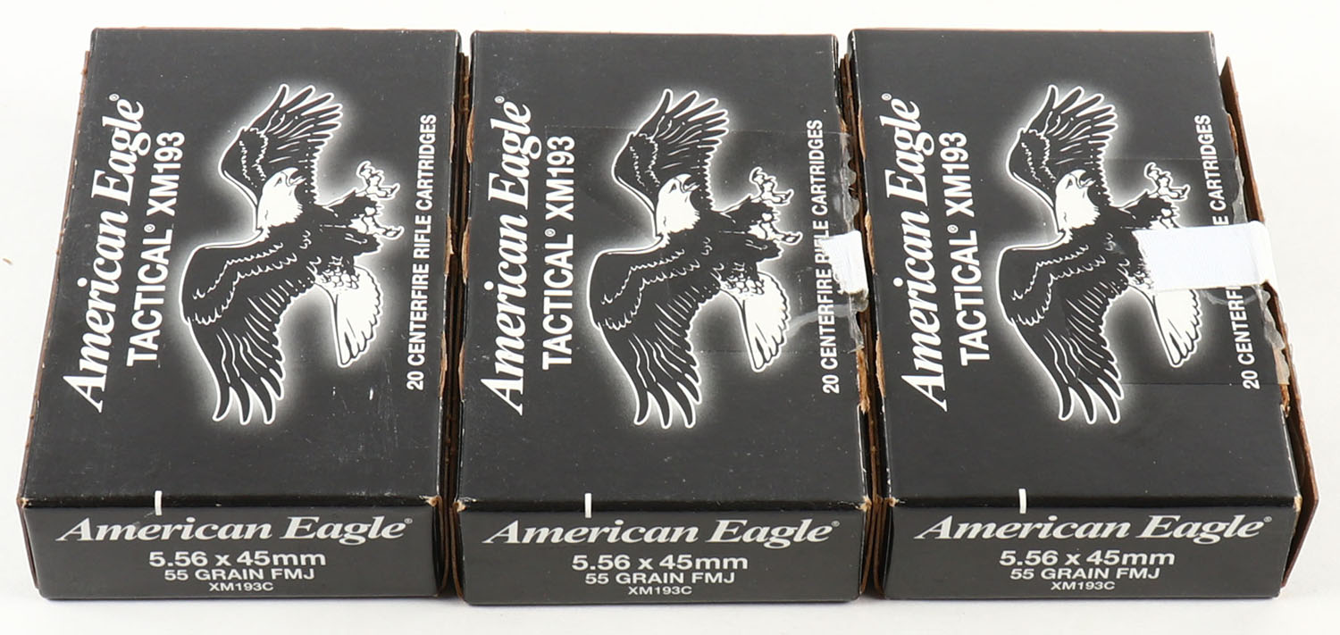 Federal, Lot of (3), American Eagle, 5.56x45mm, 55 Grain FMJ, Full, 1pc. Black & white box, boxes are solid, two boxes have tape to seam, ammo is excellent. Grade: Excellent - Value: 16 to 60