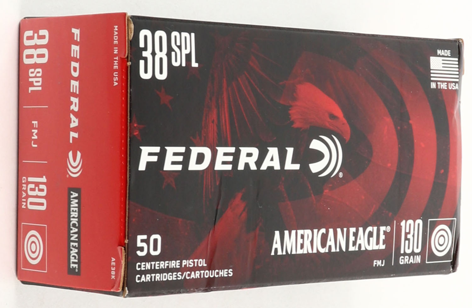 Federal, American Eagle, 38 Special, 130 Grain FMJ, Full, 1pc. Multi-colored box, box is solid with great color, end flaps are solid, ammo is excellent. Grade: MINT - Value: 10 to 40