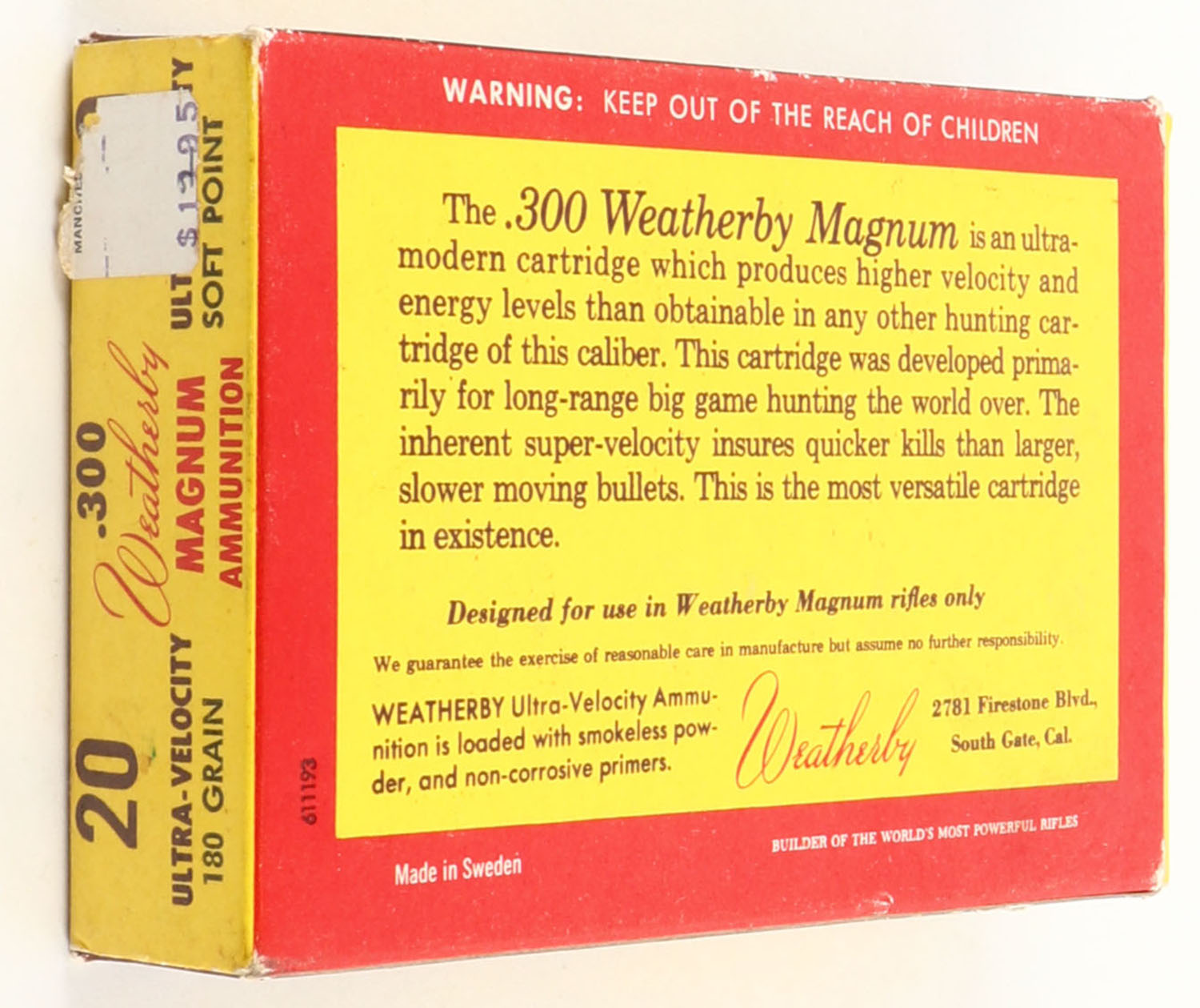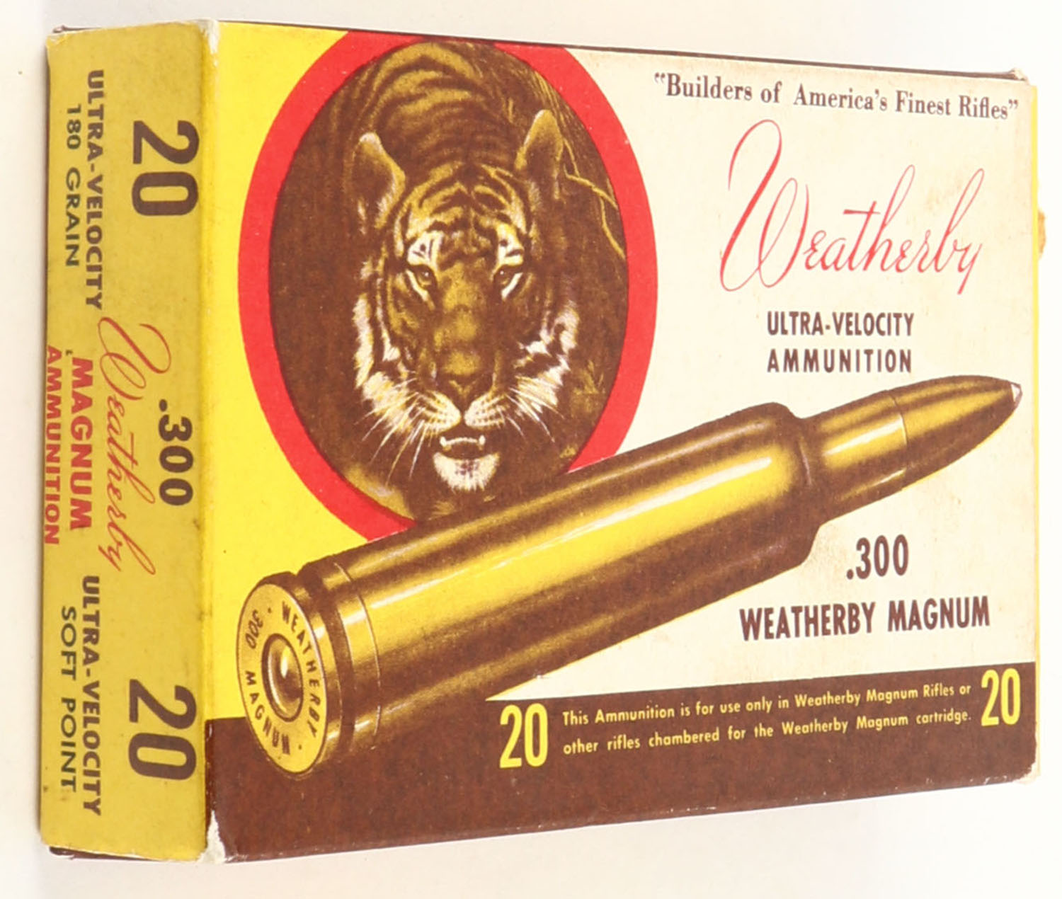 Weatherby, Ultra Velocity Ammunition, .300 Weatherby Magnum, 180 Grain Soft Point, Full, 1pc., multi-colored box, box is solid with great color, has some scuffing, end flaps are solid, ammo is excellent. Grade: Excellent - Value: 30 to 90
