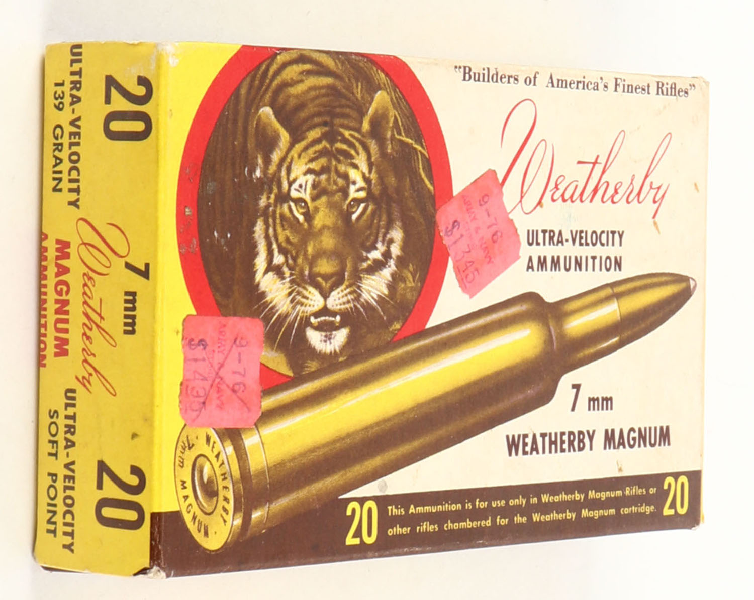 Weatherby, Ultra-Velocity Ammunition, 7mm Weatherby Magnum, 139 Grain Ultra Velocity Soft Point, Full, 1pc., multi-colored box, box is solid with very good color, very light shelf wear, end flaps are solid, ammo is excellent. Grade: Excellent - Value: 30 to 90