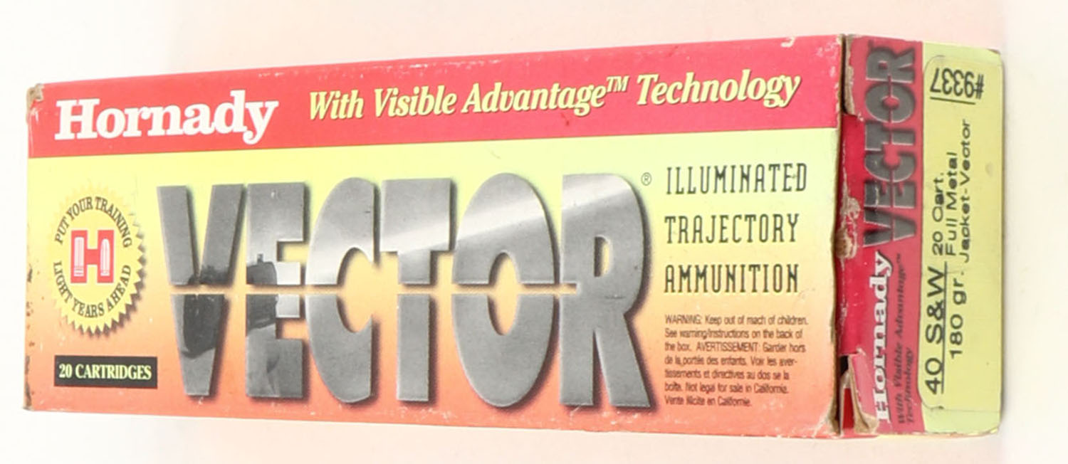 Hornady, Vector, .40 Smith & Wesson, 180 Grain FMJ, Full, 1pc., multi-colored box, box has age soiling with corner wear, ammo is excellent. Grade: Very Good - Value: 10 to 40