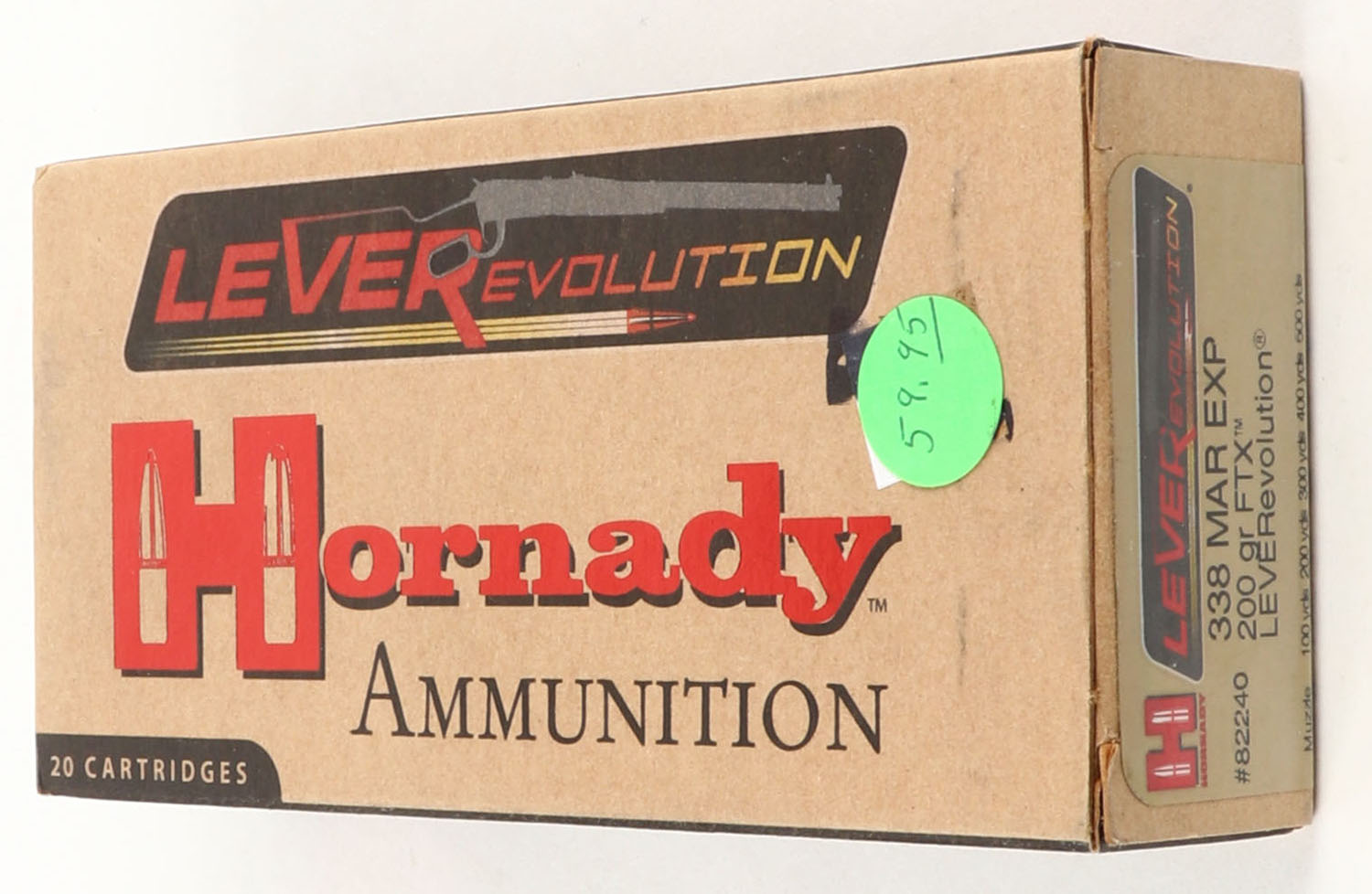 Hornady, LeverEvolution, 338 Mar EXP, 200 Grain FTX, Full, 1pc. multi-colored box, box is solid with excellent color, Ammo is minty. Grade: Excellent ++ - Value: 20 to 60