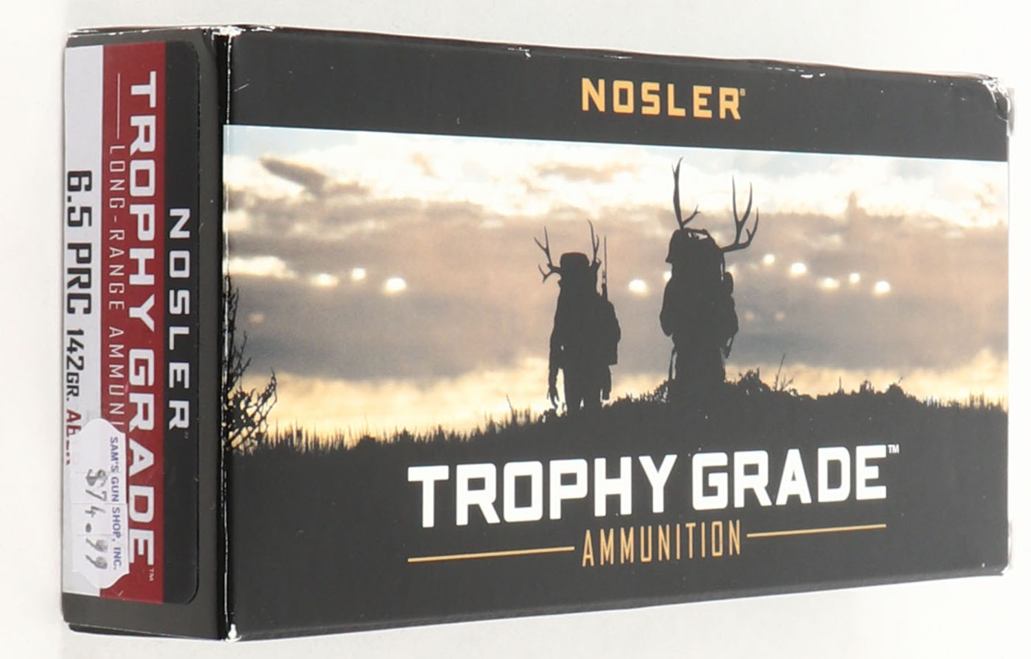Nosler, Trophy Grade, 6.5 PRC, 142 Grain ABLR, Full, 1pc. multi-colored box, box is solid with excellent color, Ammo is excellent. Grade: MINT - Value: 20 to 60