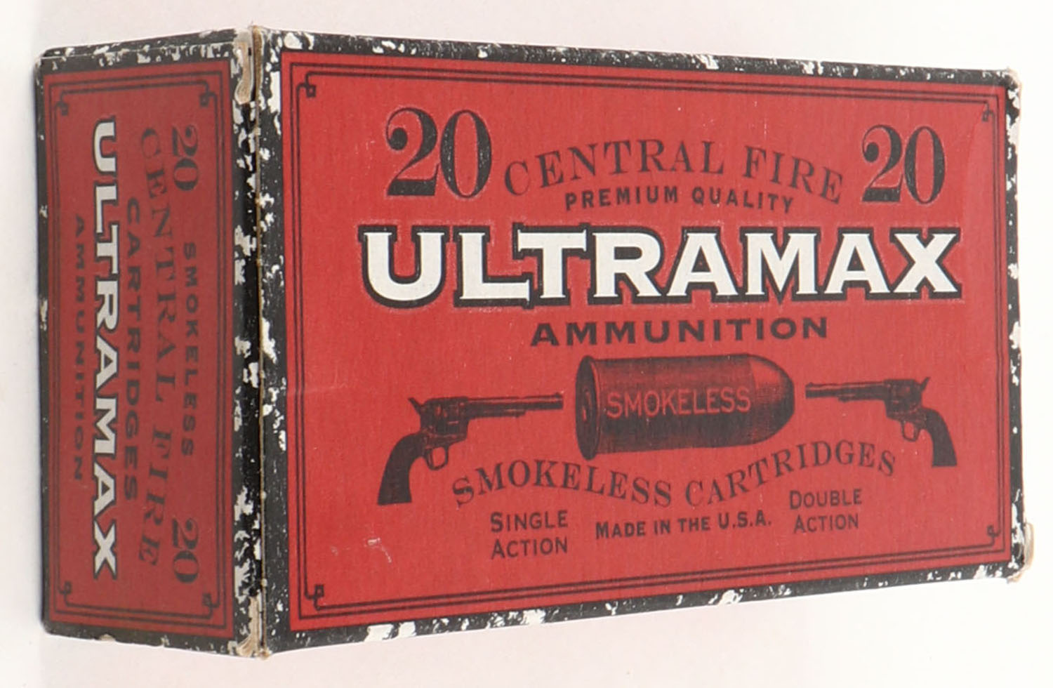 Ultramax, .45-70, 1pc, Partial 19rds, black/red box with black/white print, box is solid with excellent color very minor corner wear, end flaps are solid, ammo is very good. Grade: Excellent - Value: 16 to 60