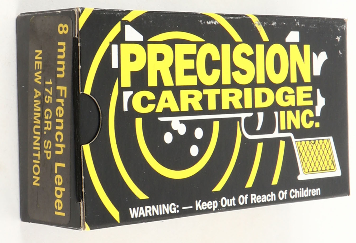 Precision Cartridge Inc., 8mm French Label, 175 Gr. SP, 1pc, Full, black box with yellow/white print, box is solid with excellent color, light rub marks, ammo is very good. Grade: Very Good ++ - Value: 20 to 60