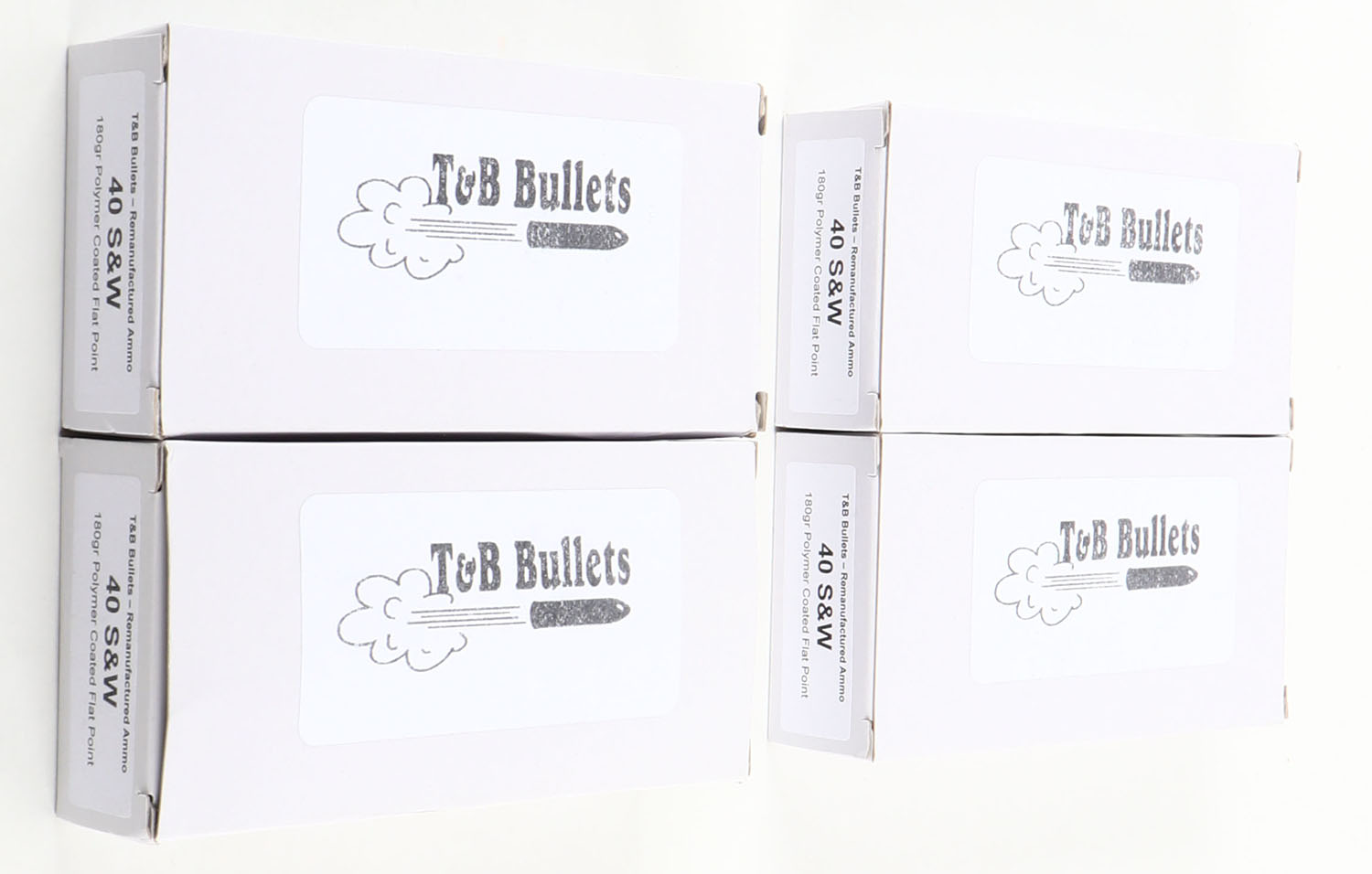 T&B Bullets, Lot of (4), .40 Smith & Wesson ammo boxes,, Remanufactured Ammo by a class type 7 Ammo MFG (this is the same class (high quality) as Winchester, Federal and or CCI), 180 Grain Polymer Coated Flat Point bullet, loaded cartridges, 1pc, Full 50 count boxes, white boxes are very solid, ammo is minty. Grade: Excellent ++ - Value: 20 to 100