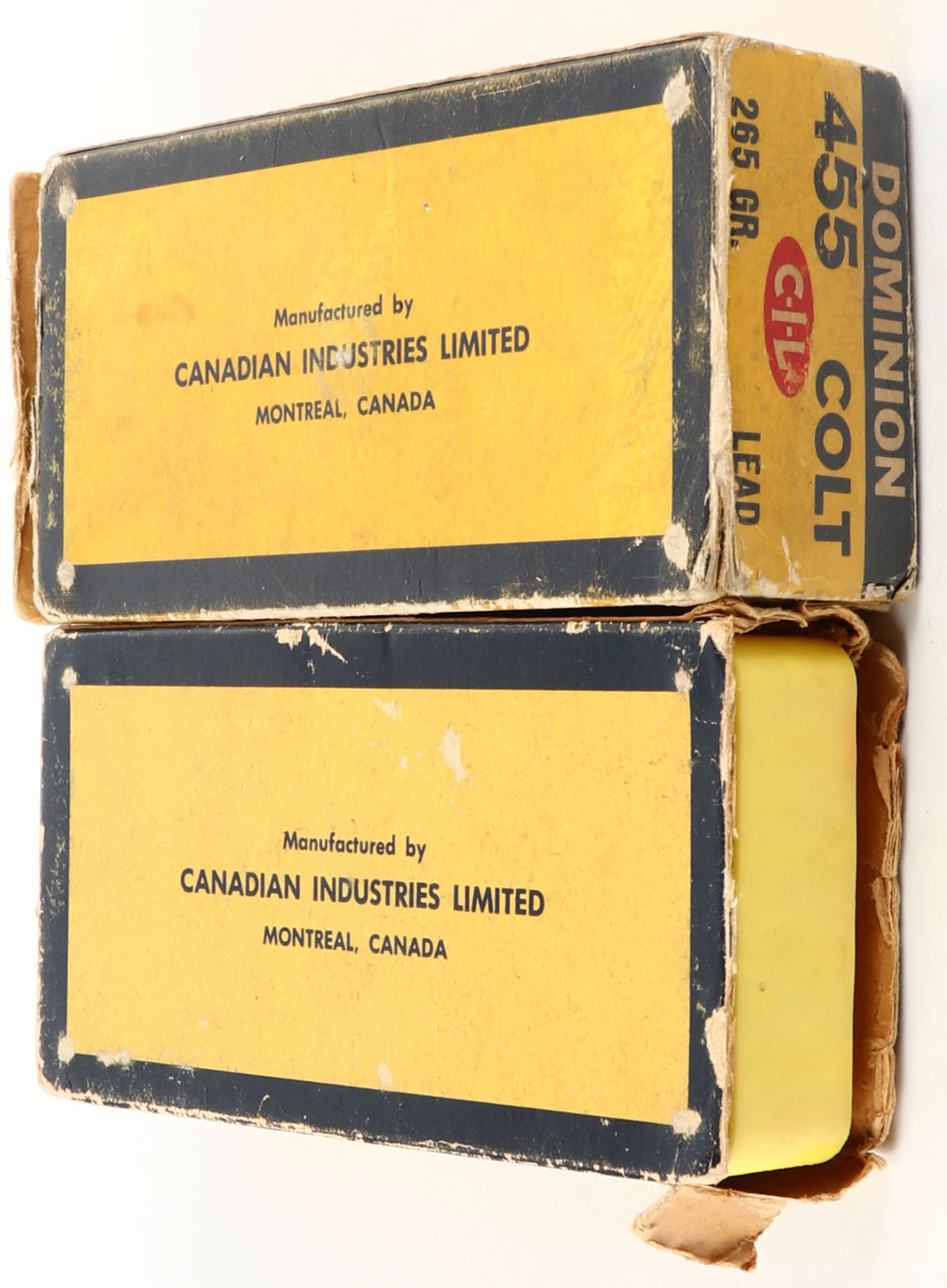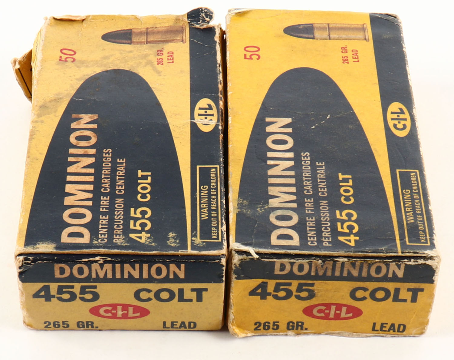 CIL, Dominion, Lot of (2), 455 Colt, 265 Grain, Partial 76rds, 1pc, multi-colored boxes, boxes have soiling & scuffing with (1) box missing end flap, ammo is very good. Grade: Good ++ - Value: 40 to 100