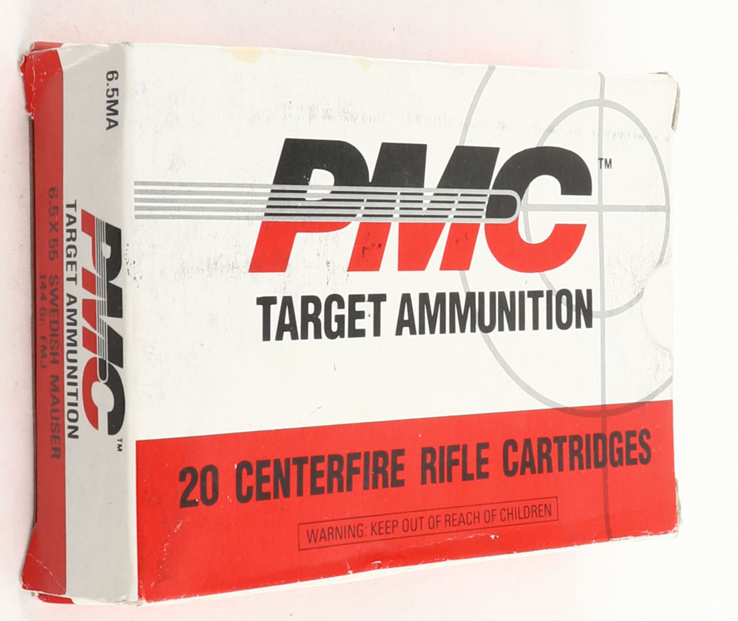 PMC, Target Ammunition, 6.5 X 55 Swedish Mauser, 144 Grain FMJ, Full, 1pc, white, black & red box, box is solid with light rub marks, ammo is excellent. Grade: Very Good ++ - Value: 20 to 60