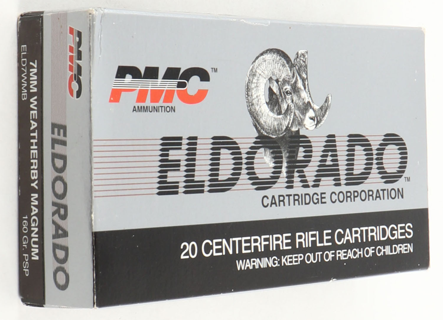 PMC, El Dorado, 7mm Weatherby Mag., 160 Grain PSP, Full, 1pc, multi-colored box, box is very solid, ammo is minty. Grade: Excellent ++ - Value: 20 to 60