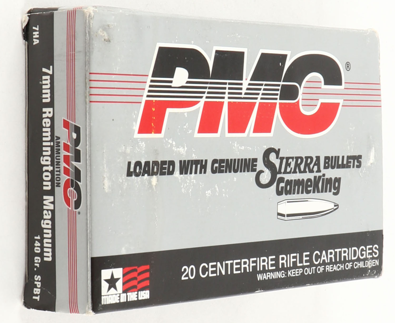 PMC, 7mm Remington Magnum, 140 Grain SPBT, Full, 1pc, multi-colored box, box has light sub marks, ammo is excellent. Grade: Excellent - Value: 10 to 50