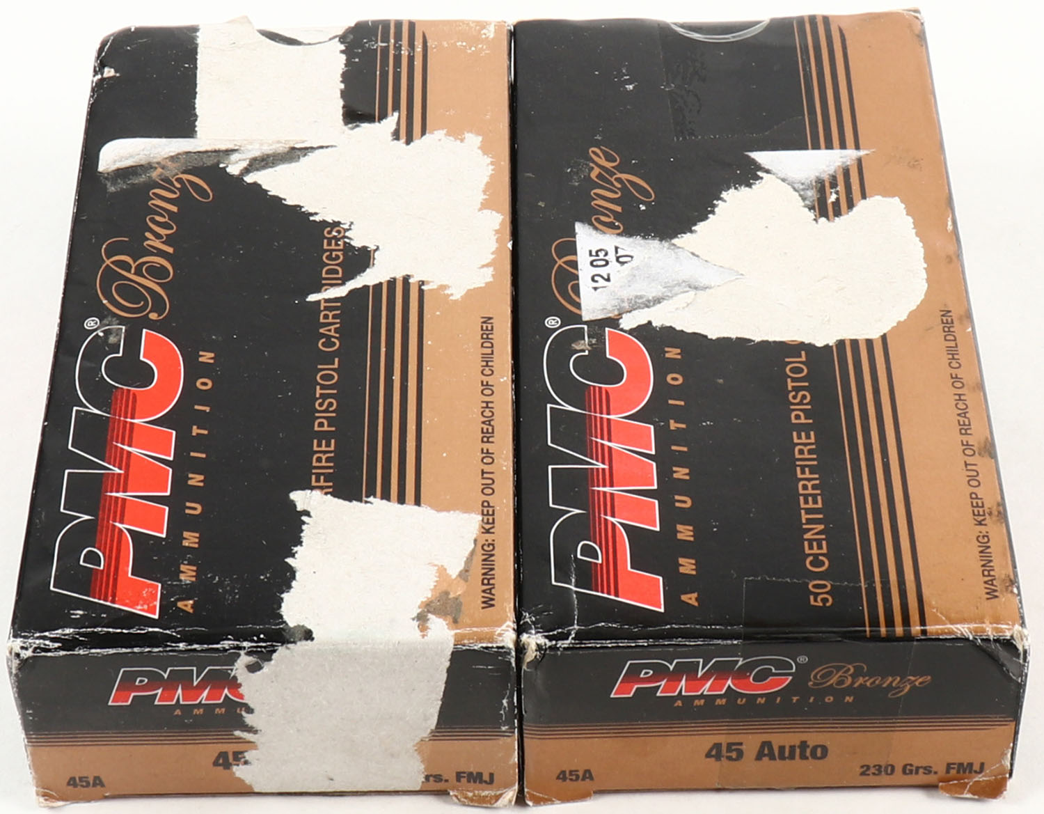 PMC Bronze, Lot of (2), .45 Auto, 230 Gr. FMJ, 1pc, Full, boxes have partial tears with scuffing, ammo is excellent. Grade: Good ++ - Value: 20 to 60