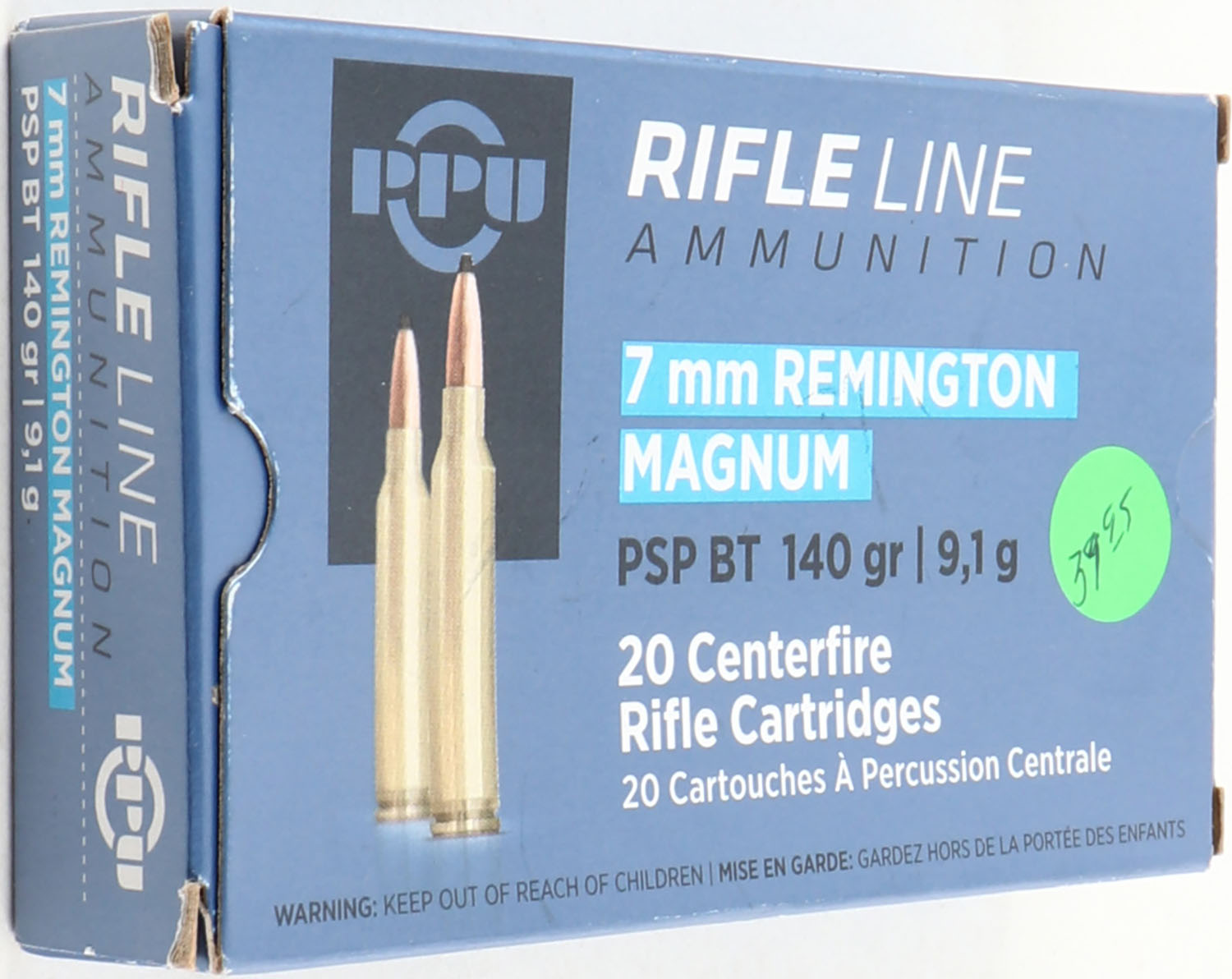 PPU, Rifle Line, 7mm Remington Magnum, 140 Grain PSP BT, Full, 1pc, multi-colored box, box is solid with light scuffing, ammo is minty. Grade: Excellent + - Value: 20 to 60