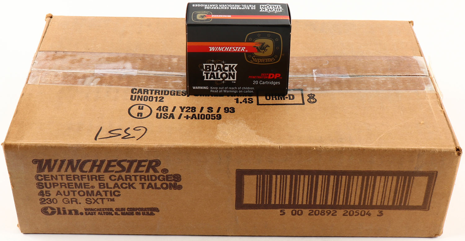 Winchester, Supreme Black Talon, .45 Automatic, Full Case, 230 Grain, SXT, 500 Rds., (25 Boxes). Grade: Excellent ++ - Value: 100 to 800