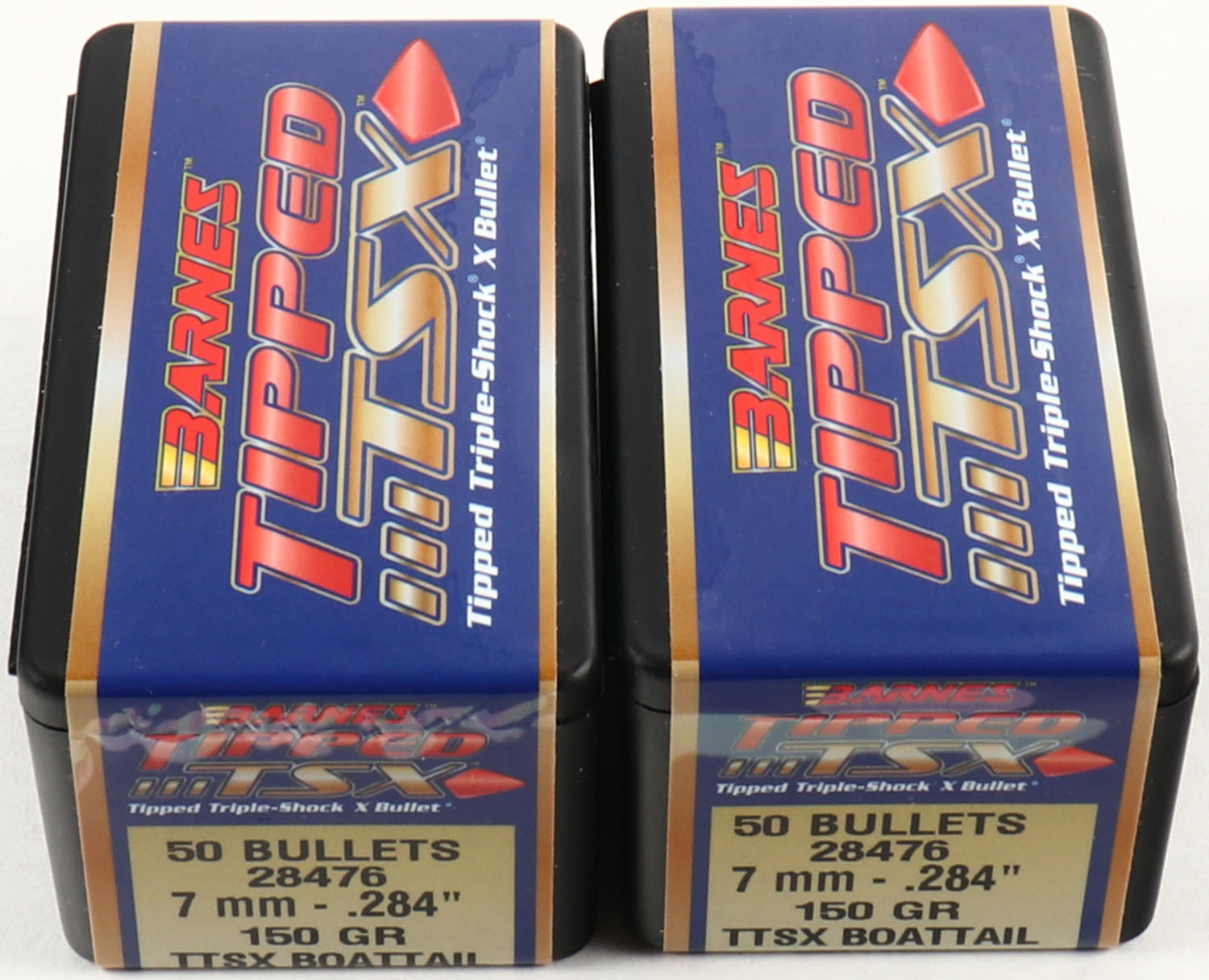 Barnes, Lot of (2), Tipped TSX, 7mm, 150 Grain TTSX BoatTail, Full, 1pc, Black plastic boxes are minty. Grade: Excellent + - Value: 20 to 60