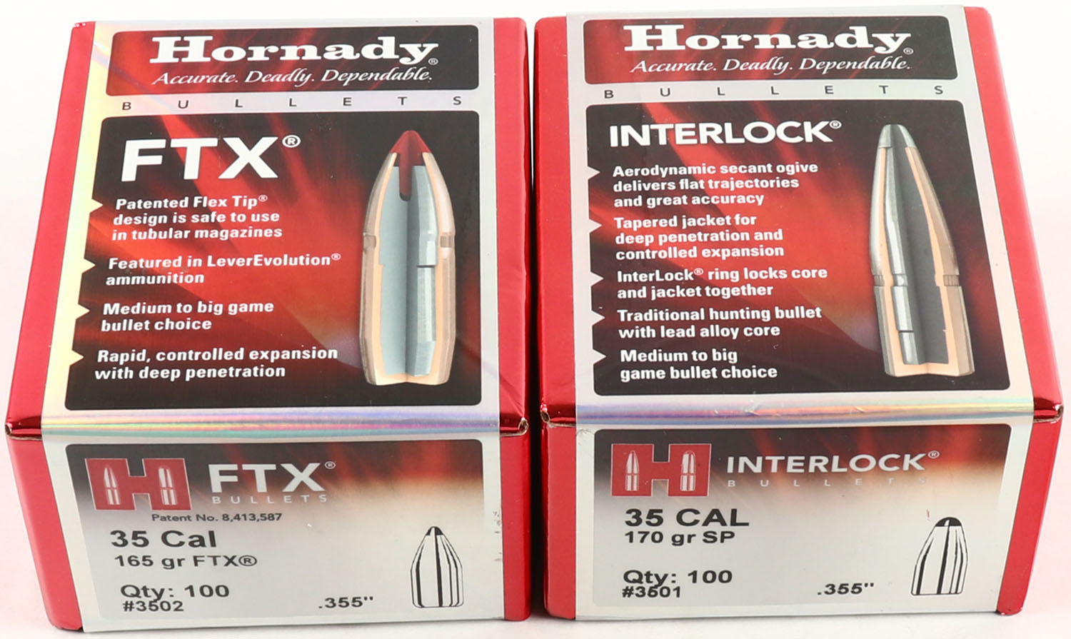 Hornady, Interlock, Lot of (2), 35 Cal., 165 & 170 Grain, .355'' Dia., FULL & SEALED, 2pc, Multi-colored box, box is minty. Grade: Excellent ++ - Value: 20 to 80