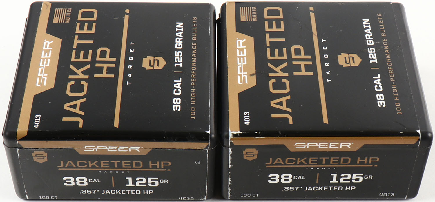 Speer, Lot of (2), Jacketed, 38 Cal., 125 Grain, .357'' Jacketed HP, (1) box is partial, other box is FULL & SEALED, 1pc, Black Plastic box with brown & black label, box is solid, bullets are excellent. Grade: Excellent - Value: 20 to 60