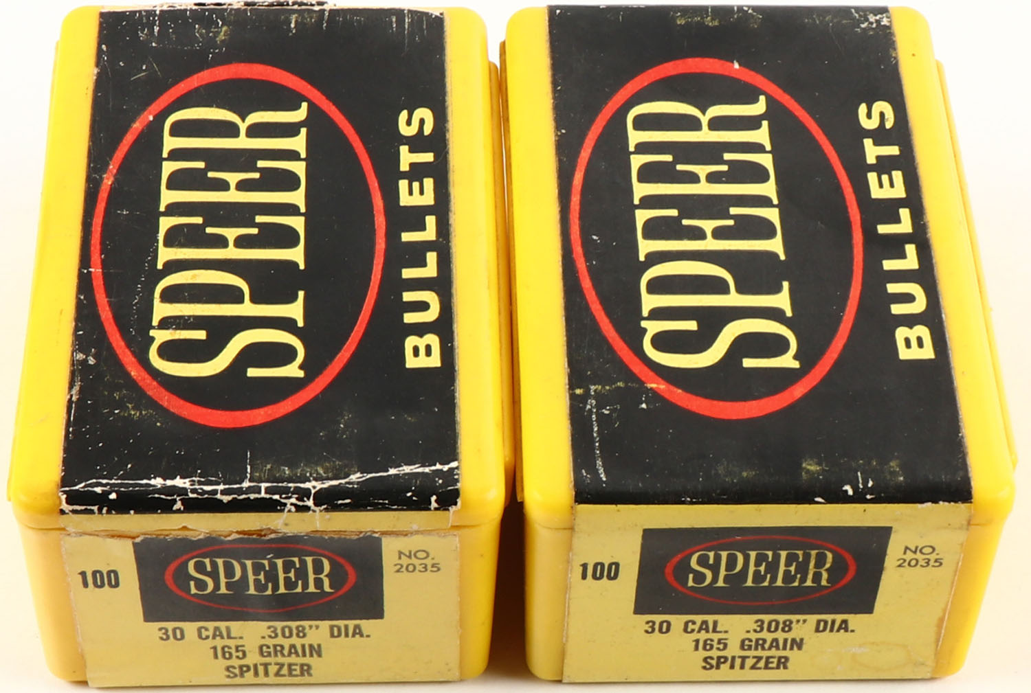 Speer, Lot of (2), 30 Cal., 165 Grain Spitzer, .308'' Dia., (1) box FULL & SEALED, (1) box appears partial, 1pc., Yellow plastic boxes with black & yellow, boxes are solid. Grade: Very Good ++ - Value: 20 to 60