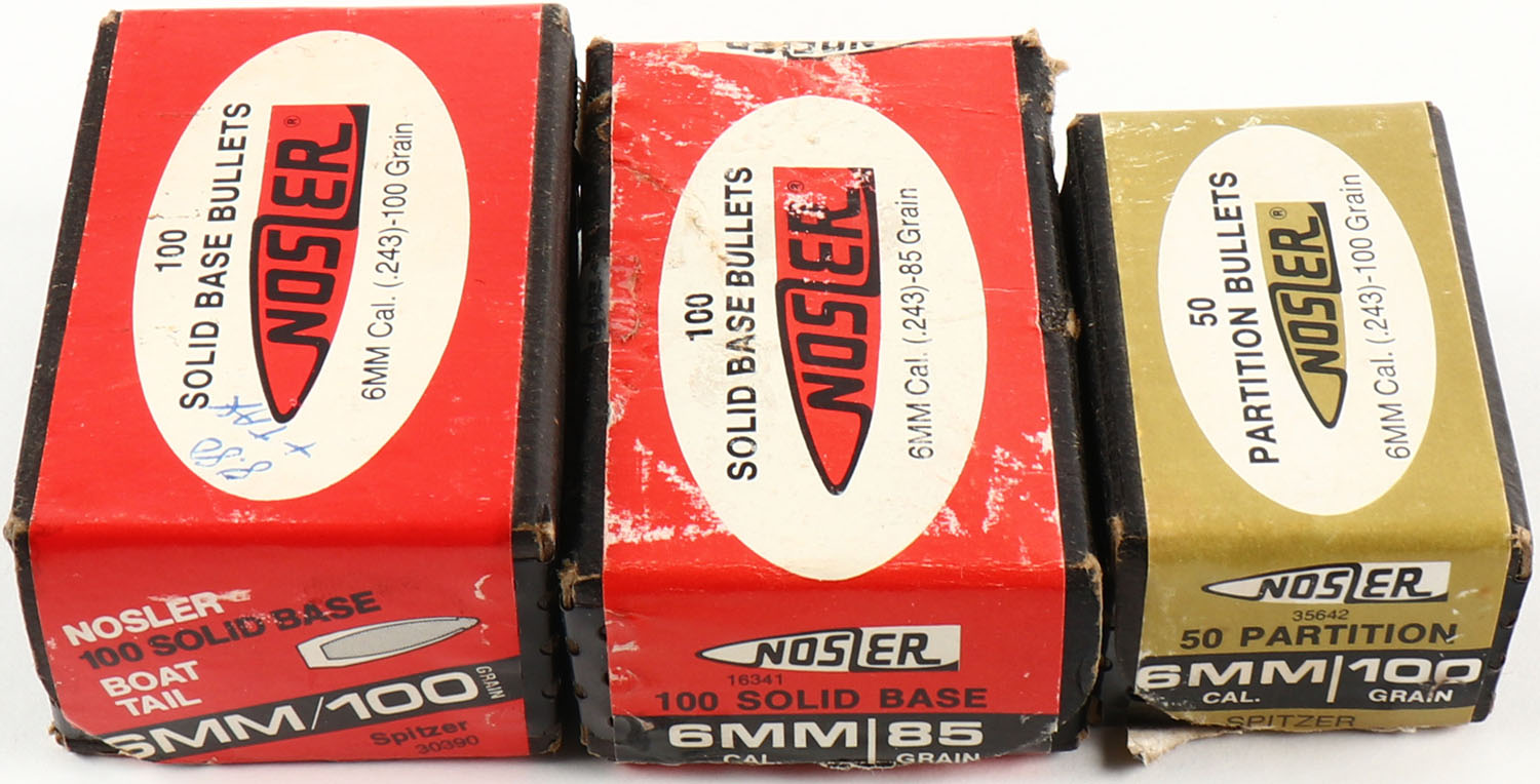 Nosler, Lot of (3), 6mm, 85 & 100 Grain Spitzer, .243'', boxes have some scuffing, bullets are excellent. Grade: Good ++ - Value: 10 to 60