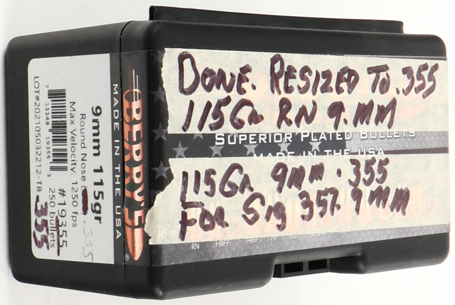 Berry's Superior Plated Bullets, 9mm, 115 Grain .355'' RN, Appears Full, 1pc, black plastic box has tape over label, bullets are minty. Grade: Excellent - Value: 10 to 40