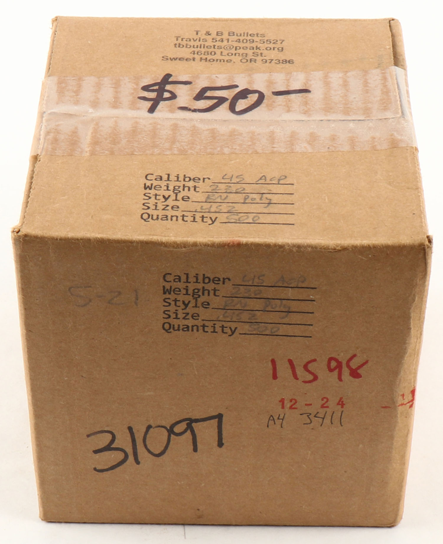 (1) Factory sealed box 45 ACP (.452), 230 gr, RN Poly, T & B Bullets, 500 ct. Grade: Mint - Value: 30 to 100