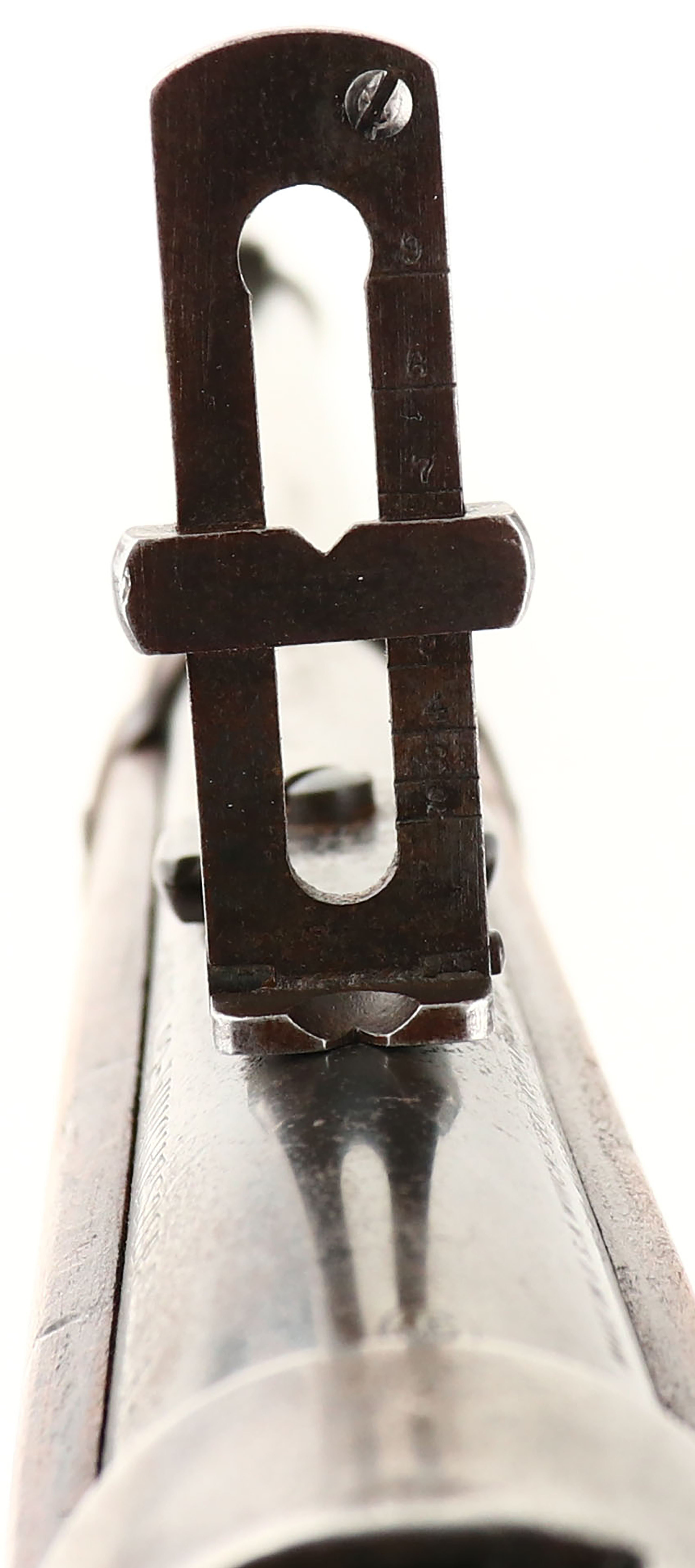 VERY RARE Winchester, Model 92 SRC TRAPPER, marked 44 WCF, MFG. 1924, SN: 934212, Lever Action Rifle, 14'' Round TRAPPER barrel, Full mag. The original stocks are very good & solid. The forend is the shorter 8'' trapper length. The stocks have a flat finish appearance, having been cleaned, lightly sanded & refinished. There is a 1/4'' contusion fill on the right side edge of the forearm, a corner edge fill at the lower right corner of the wrist & a couple of very small edge fills on the right side wrist against the receiver, all of which match well & are not distracting. The is a 1 1/2'' tight hairline crack at the bottom of the forend tip & a small contusion on at the left wrist against the receiver. There are a few other minor blemishes, giving the wood a very nice overall appearance. The factory metal blue has worn thin, but there remains areas of original blue on the barrel, receiver, mag tube & lever, which is quite rare amongst trappers as most are worn silver or are brown guns. The balance of the metal is a mix of thin brown patina & areas worn to silver. The bore is excellent, bright & clean, with strong rifling. Fitted with standard factory carbine flip-up rear ladder sight & blade on box front sight. The stock carries a steel carbine buttplate. Original saddle ring on left side This Trapper is listed with the ATF by SN as an exempt trapper rifle. This is your opportunity to purchase a very rare 14'' Trapper in above average condition. Truly a wonderful little 92 Trapper in the highly preferred 44 WCF. FFL or C&R Req. - Value: 8000 to 12000