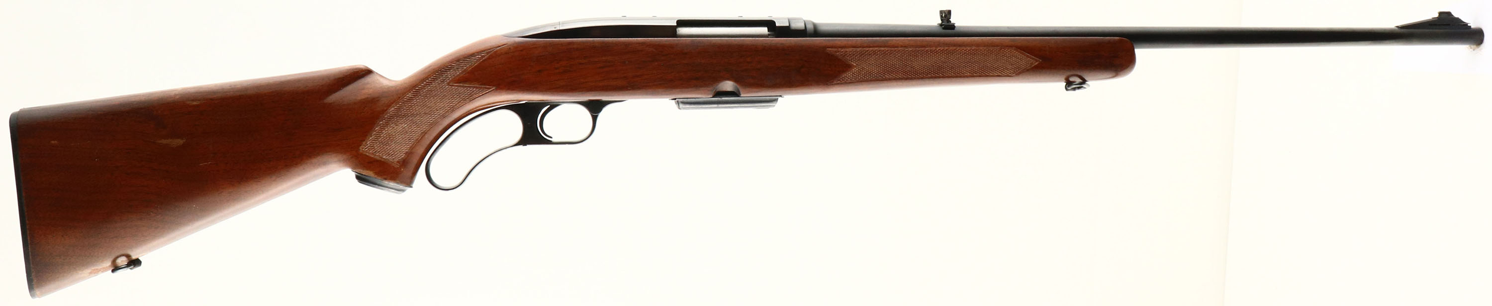 Winchester Model 88, CAL: 308 WIN, MFG: 1962, SN: 132550A, Lever Action Rifle, 22'' barrel. Pre-64. The original checkered & capped pistol grip wood stock is good. It displays several scrapes, scratches & contusions to the original finish, which has thinning & flaking wear, & has heat damaged, with area of foreign material stuck to it & finish removed. The original metal blue finish remains at 90%, with parts toning plum. Bore is excellent. The barrel holds the original flip-up rear sight & a ramp front sight missing the hood. Stock carries a the original checkered plastic buttplate. Sling swivels. Winchester detachable mag. FFL or C&R Req - Value: 400 to 800