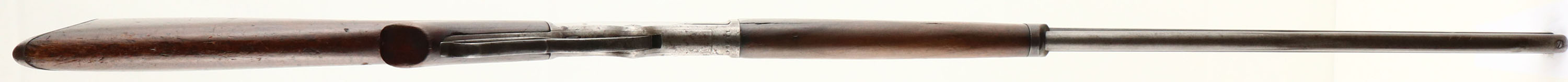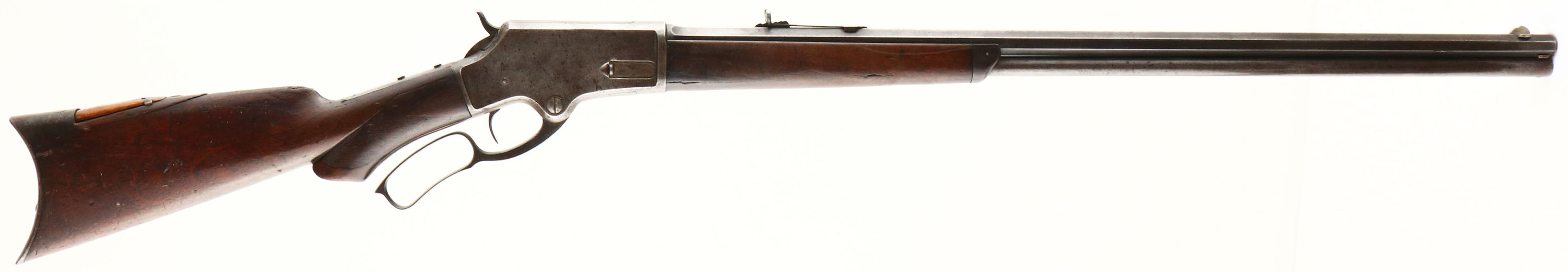 Marlin, Model 1881 Deluxe, marked 38-55 Cal., MFG. 1886, SN: 13294, Lever Action Rifle, 28'' Octagon barrel, Full mag. The original deluxe checkered & scalloped pistol grip wood stocks are fair. Much of the original checkering has smoothed due to heavy use. The forearm has a 2 1/2'' crack to the lower right side. The stock has a large 4'' broken chunk along the back of the comb, which has a few chunks nailed back into space, both original wood & an additional lighter toned piece of wood. There are numerous small scrapes, scratches & contusions. The metal surfaces have worn mostly gun metal gray, with a mix of spotty thin brown patina & remnants of original blue, mainly on the lower flats of the barrel. The receiver upper tang previously held a tang sight, with mounting screws remaining. Barrel carries an adjustable rear sight, with a replaced elevator & a Lyman half moon blade front sight. There are a couple of dents in the mag tube 1 1/2'' from muzzle. Bore is good, with some roughness amongst strong rifling. Stock carries a crescent metal buttplate. There is an open hole in front of the trigger under the lever. e action remains tight & smooth. The rifle has a well worn Old West esthetic & is an early era deluxe lever. Antique No FFL Req. - Value: 500 to 1000