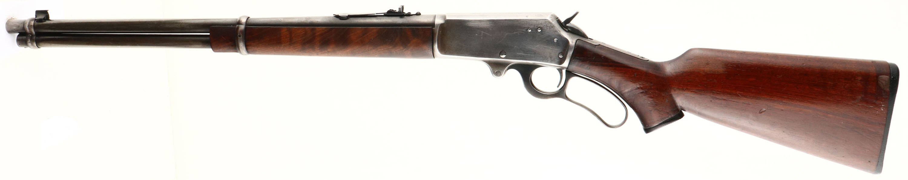 Marlin, Model 36 Carbine/Rifle, CAL: 30-30 WIN, MFG: 1947, SN: D18262, Lever Action Rifle, 20 1/4'' barrel, Full mag. The original flat pistol grip wood stocks are good & solid. The stock has been sanded & non-professionally refinished. The pistol grip has an added plastic cap. The forend has very nice rippled grain. The stock has a 1'' missing chunk at the buttend & near the comb. The original metal blue finish has worn mostly gun metal gray, with a thin brown patina & remnants of original blue. Bore is excellent. The barrel carries updated sights of Marbles adjustable rear & elongated tall blade front sights. Stock carries a Fajen plastic buttplate. Stock has the Marlin trademark bullseye in the stock. A good lever action 30-30 hunting rifle. FFL or C&R Req. - Value: 300 to 600