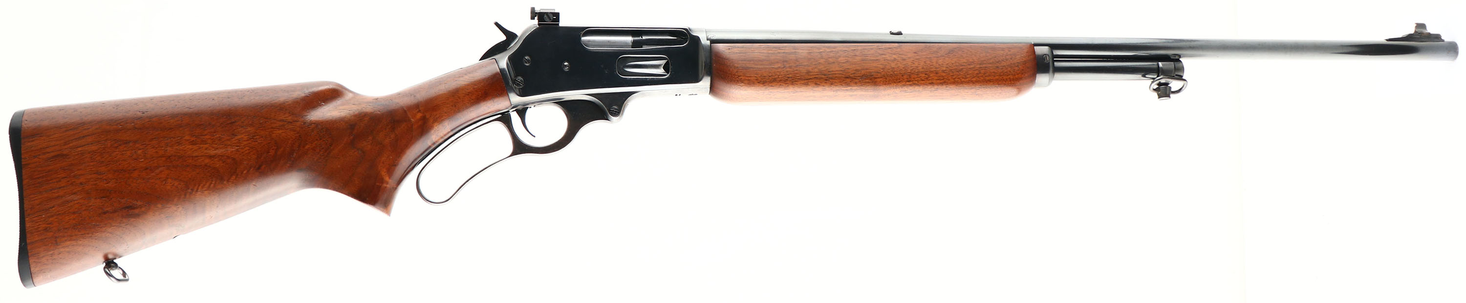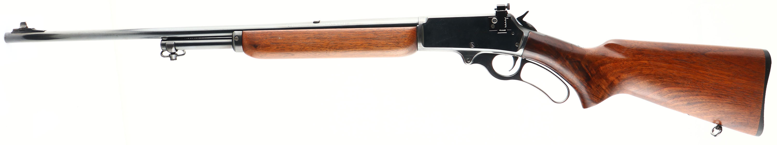 Marlin, Model 336 A, marked .35 REM Cal., MFG. 1951, SN: H310011, Lever Action rifle, 24'' round barrel, Full mag., The original flat pistol grip wood stock is very good & solid. The left side of the wrist has two tight grain cracks running from the upper to lower tang. The stocks have been sanded & nicely refinished, with the stock having very nice rippled & feathered grain. There remains a few small scratches or contusions. Marlin bull's-eye in stock is missing. The reblued metal blue finish rates 85% overall, with most wear on the belly of receiver & lever. The receiver mounted with a Williams side mount receiver sight, while the barrel carries a Marble blank filled rear dovetail & large blade front sight. Bore is excellent. Stock carries a Marlin plastic buttplate. Tight smooth action. Sling loops. A nice looking hunting lever action. FFL or C&R Req. - Value: 300 to 600