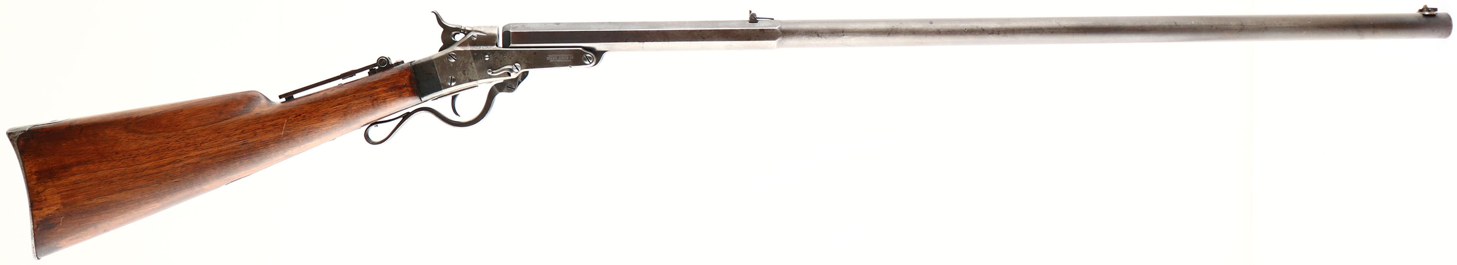 RARE Mass Arms Co. Edward Maynard Patent, Model 1873, Cal. 40-40 Maynard. MFG circa 1880's, Antique, SN: 26053. Single shot lever operated tip-up rifle. 32'' Octagon/round barrel. Dr. Edward Maynard (1813-1891) was both a brilliant dentist & a gifted inventor. Born in Madison, New York, Maynard entered the United States Military Academy at West Point, but was later forced to resign due to poor health. Prior to the Mexican War, Maynard invented a mechanical priming system for use with percussion arms, which was intended to replace the copper primers that had been used almost since the invention of this ignition system. Perhaps Maynard's most significant firearms invention was his tip-up single-shot metallic-cartridge breech loading rifle, which he patented in 1851. The Maynard First Model carbine was adopted by the U.S. Army in 1856, which sparked the formation of the Maynard Arms Corporation during the following year. The Massachusetts Arms Company of Chicopee Falls, Massachusetts, later undertook the manufacture of the Maynard rifles & carbines. The Massachusetts Arms Company continued to produce Maynard rifles until 1890. The smooth straight, grip walnut stock appear original & is good & solid, despite there being a 3'' crack repair on the left side of the wrist, which utilized three pins to stabilize. The stock has been sanded & refinished. There remains minor scrapes, scratches & dings, with the metal edges being proud to the wood. The buttstock carries a silver color upper tang metal buttplate. The metal blue finish on the barrel has mostly worn to a gun metal gray, with a thin brown patina & remnants of original blue in protected areas. The case-hardened receiver, lever & lower tang have all worn gun metal gray. Markings on left side of receiver are double stamped in 4 lines: ''Edward Maynard'' ''Patentee 1873'' ''May 27, 1851'' ''Dec 6, 1859''. Markings on right side of receiver are 3 lines: ''Manufactured by'' ''MASS ARMS CO'' ''Chicopee Falls''. The rifle mounted with a Vernier tang peep sight with elevation adjusting aperture base missing the aperture. The barrel carries a flip up two leaf rear sight & folding globe front sight. Bore is very good & clean, but with so areas of light roughness amongst strong rifling. Some of the screws show slot wear. Action is very tight, barrel to receiver has no play & appears to function well. Overall condition is very good, as all parts appear original & complete.* Antique, No FFL Req - Value: 1000 to 2500