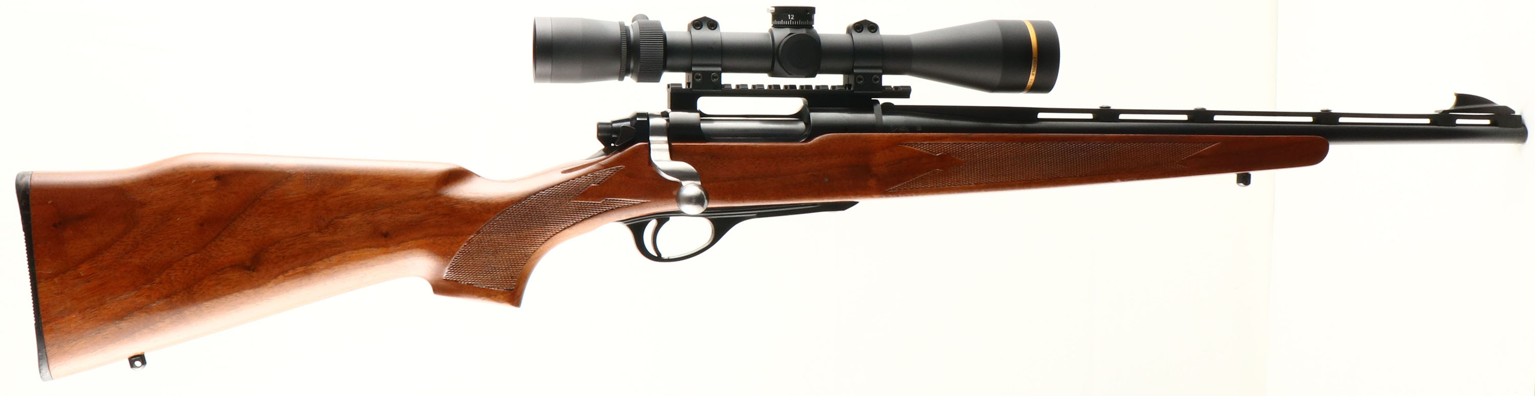 Remington, Model 600 Carbine, CAL: .222 REM, MFG: 1966, SN: 67521, Bolt Action Rifle, 18 1/2'' barrel. The original press checkered, raised comb & flat pistol grip wood stock is excellent, with a few small scuffs & contusions to the original finish. The metal blue finish rates 98% overall. Bore is excellent. The receiver carries a Leupold VX-3HD 4.5-14X40 Gold Ring scope mounted on a EGW REM 660 0MOA Picatinny rail. The rear sight has been removed from the ventilated rib, but it still carries the elevated blade front sight. Buttstock carries a Remington plastic buttplate. Dog leg bolt handle. Sling studs. A great little compact hunting rifle & nicely set up. FFL or C&R Req. - Value: 800 to 1200
