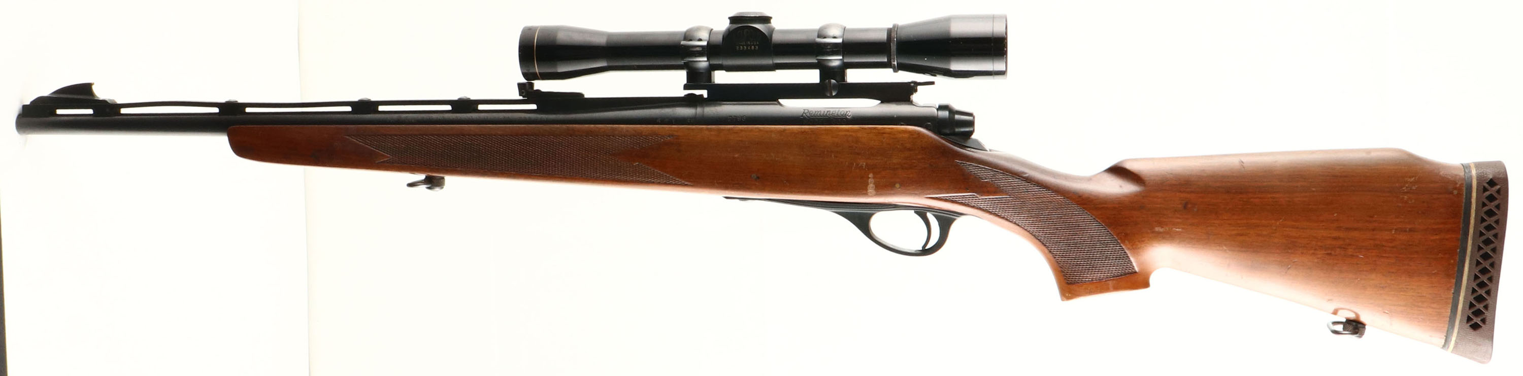 Remington, Model 600 Carbine, CAL: 222 REM, MFG: 1964, SN: 2796, Bolt Action Rifle, 18 1/2'' barrel. Early first year production rifle. The original press checkered, raised comb & flat pistol grip wood stock is excellent, with a several small scuffs & scrapes to the original finish. The metal blue finish rates 95% overall. Bore is excellent. The receiver carries a Leupold M8-4X Gold Ring scope mounted on Redfield rings & rail. The ventilated rib carries the original rear & elevated blade front sights. Buttstock carries a Pachmayr ventilated recoil pad. Dog leg bolt handle. Sling loops. A great compact bolt rifle & set up for hunting season. FFL or C&R Req. - Value: 700 to 900