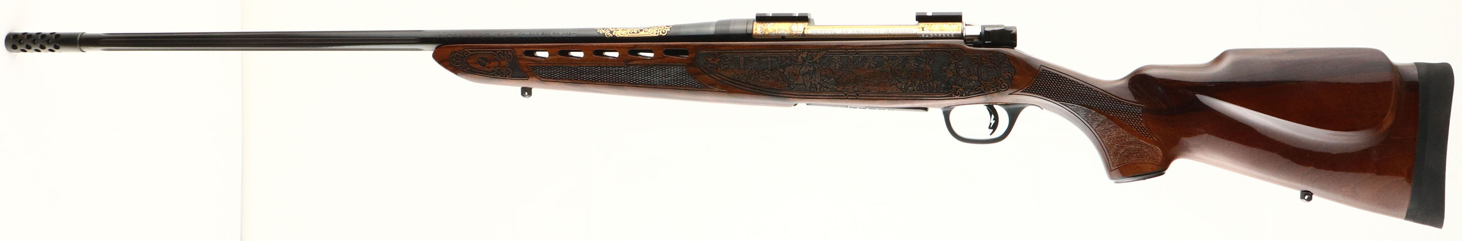 BOXED Mossberg O F & Sons Inc, Model 4X4 NRA Limited Edition, State of Idaho Hunting American tradition rifle. CAL: 300 Win Mag, MFG: Modern, SN: BA275333, Bolt Action Rifle, 25'' Tapered & fluted round barrel, 26 3/8'' with muzzle break. This beautiful rifle is numbered on the right side ''12 of 100'' & features etched & gold/silver filled NRA motifs & game scenes on the receiver & barrel. The original capped pistol grip walnut stock is excellent, & features laser cut games & hunting scenes on both sides, with the under side of the forend marked ''National Rifle Association''. The original metal finish 99% overall. Bore is excellent. The receiver is fitted with scope mounting blocks, & no open sight provisions on the barrel. Stock carries a factory solid recoil pad. Sling studs. Detachable mag. Two-position safety. Jeweled bolt. Comes in the original SN matching box, with paperwork & lock. FFL Req. - Value: 800 to 1200